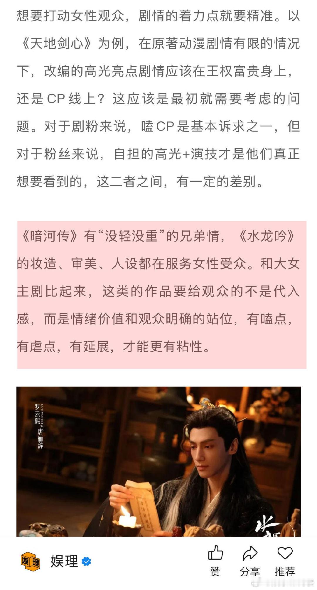 三大男主剧对打为何没有赢家 大男主剧如何才能留住观众 去年此时的古偶混战,《永夜星河》《珠帘玉幕》《大梦归离》一起播出。对比今年的情况,三部大男主剧《暗河传》《水龙吟》《天地剑心》与前者确实有一定的差距。当然,相较于去年,今年影视行业整体的流量水位也更低了一些。影视行业需要对打的热闹,更需要抗打的作品…娱理独家↓