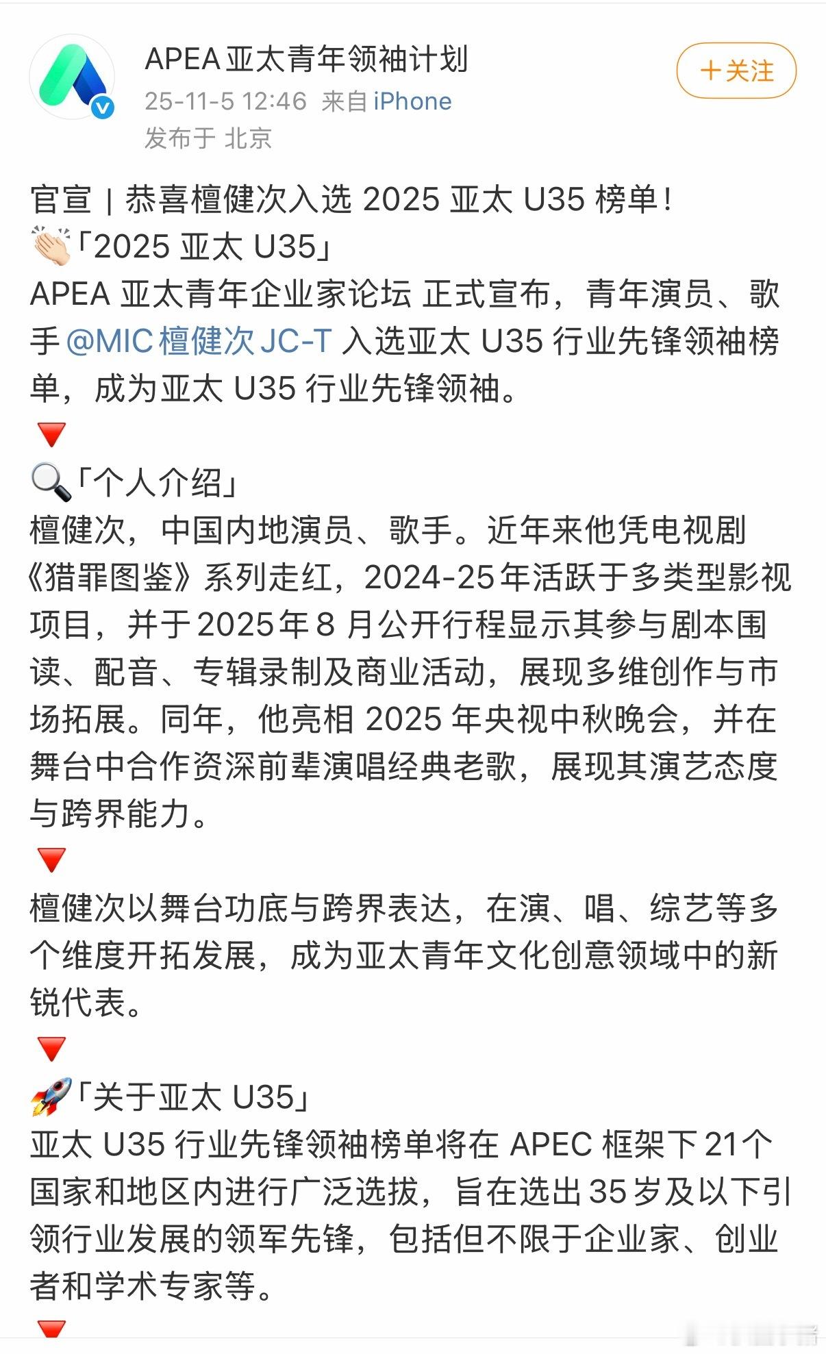檀健次入选 2025 亚太 U35 榜单官宣!恭喜全能艺人檀健次,优秀![打call]