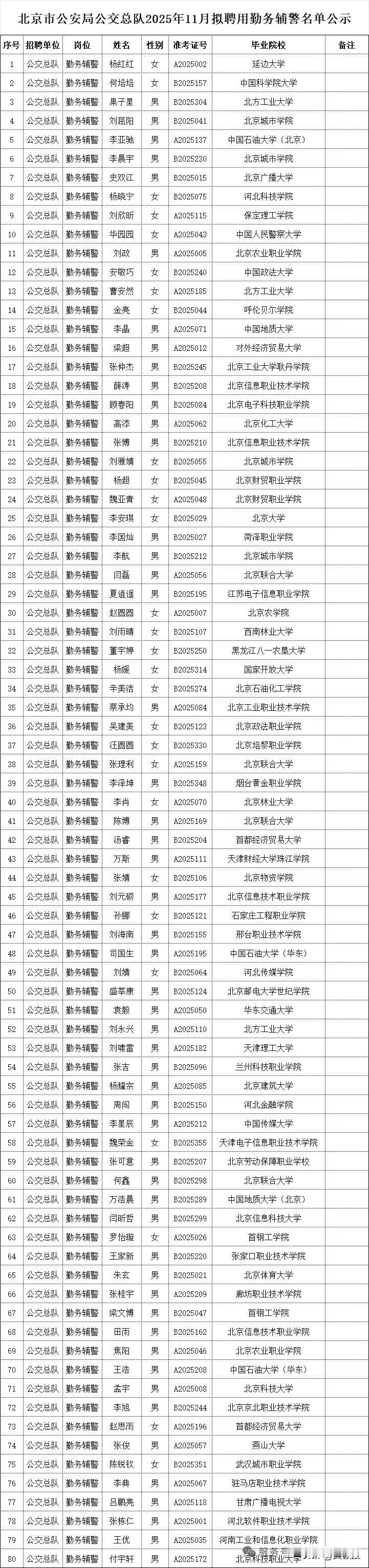 北京市公安局公交总队 2025年11月份拟聘用勤务辅警名单公示