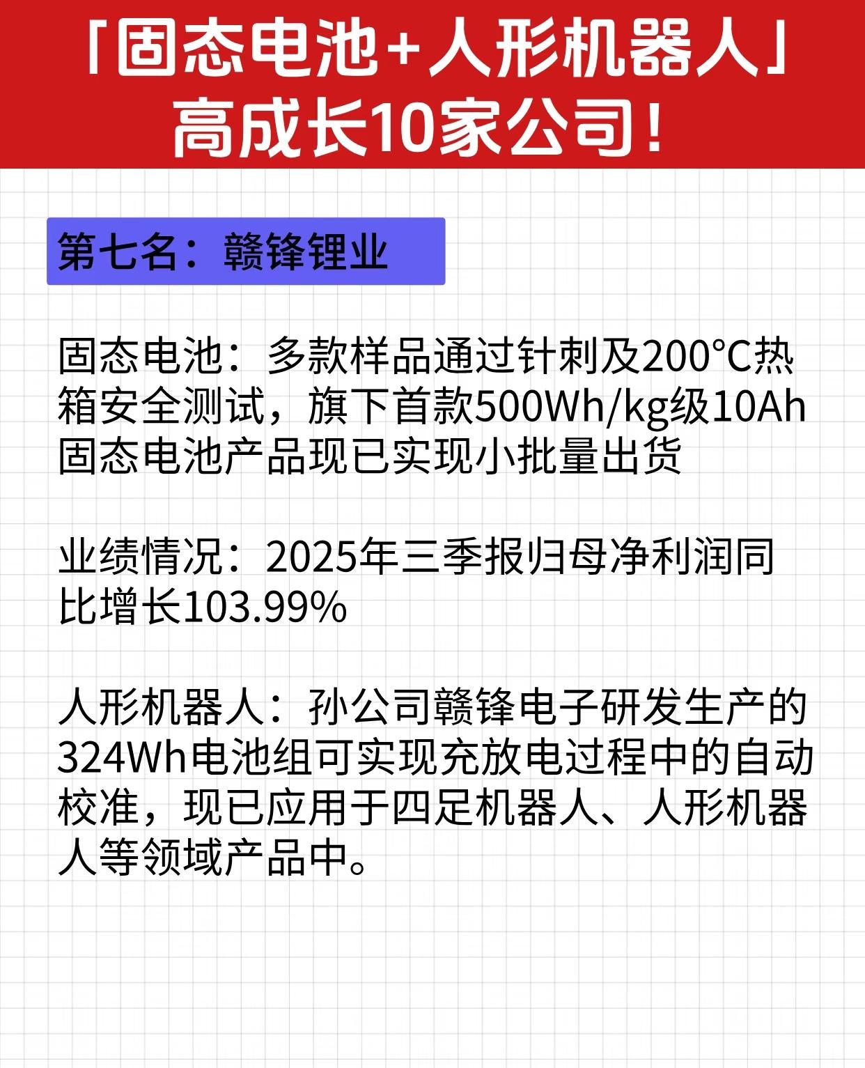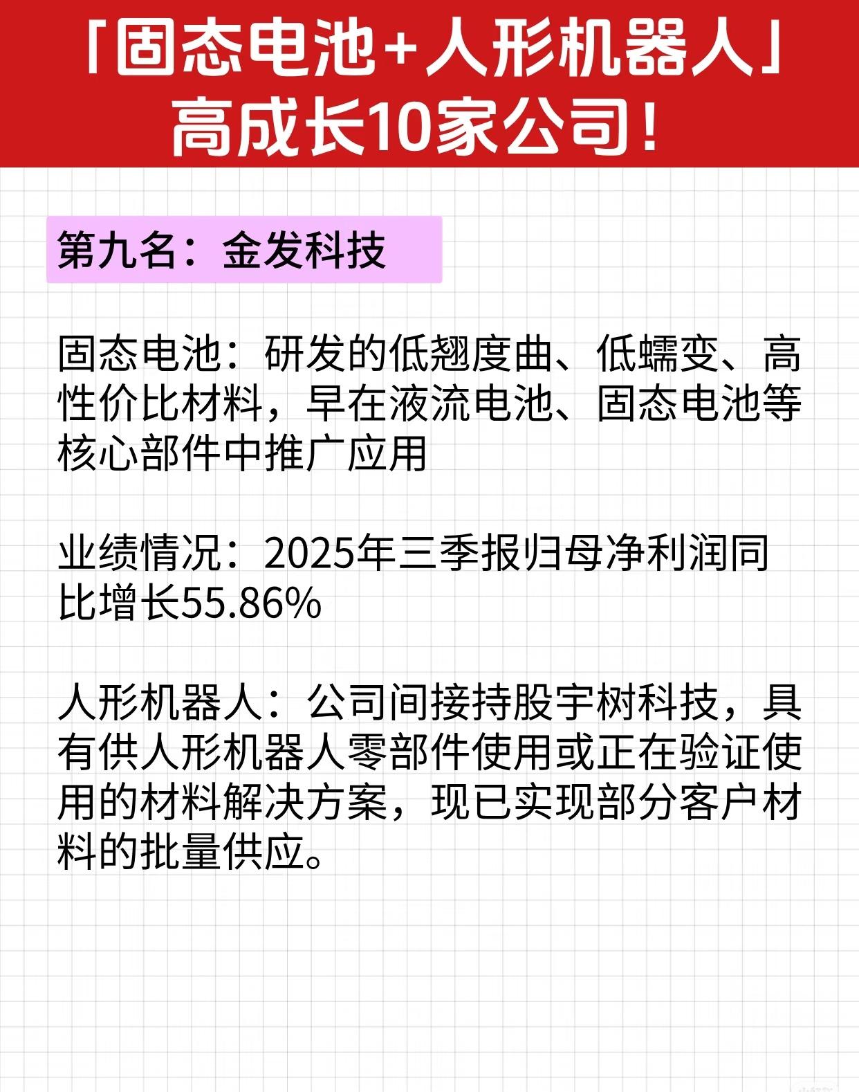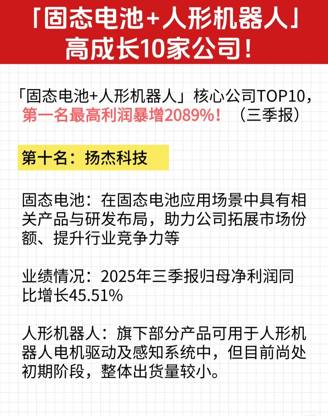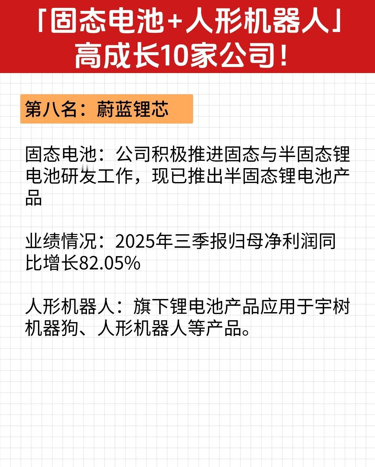 以下是关于“固态电池+人形机器人”高成长10家公司的综合介绍(收藏研究): 1. 第一名:楚江新材 - 固态电池:子公司顶立科技拥有固态电池电解质粉体制备用热工装备,为相关加工企业提供技术支持。 - 人形机器人:子公司鑫海高导是铜导体领域领先企业,已布局人形机器人相关铜导体产品,并实现向多家知名线束企业的批量供货。 - 业绩:2025年三季报显示归母净利润同比增长高达2089.49%,增速位居榜首。(提醒:当前公布三季报公司数量有限,样本较小,市场波动风险需警惕) 2. 第二名:远东股份 - 固态电池:积极布局全固态电池与锂离子电池前沿技术,推动全球圆柱电芯技术进步。 - 人形机器人:旗下人形机器人专用电缆产品已广泛应用于机器人及专精特新领域,并与优必选、智元等头部机器人企业达成战略合作。 - 业绩:2025年三季报归母净利润同比增长268.86%。 3. 第三名:道氏技术 - 固态电池:重点布局固态电池所需核心材料,包括高镍前驱体、固态电解质与金属锂负极等。 - 人形机器人:正开展碳纳米管(特别是单壁碳纳米管)的研发与市场推广,与头部机器人公司开展相关合作研究。 - 业绩:2025年三季报归母净利润同比增长182.45%。 4. 第四名:天永智能 - 固态电池:公司及子公司与卫蓝、恩力等企业签约合作,钠离子电池生产线项目与海能等公司开展合作。 - 人形机器人:在现有工业机器人基础上持续研发升级,目标是打造具备高精度操作能力的新型人形机器人智能设备。 - 业绩:2025年三季报归母净利润同比增长167.86%。 5. 第五名:豪鹏科技 - 固态电池:推进“自适应键合作用”技术,利用大分子官能团动态键合特性,在零加压条件下实现稳定界面,技术处于稳步推进阶段。 - 人形机器人:已成为多家服务型及人形机器人客户的供应链合作伙伴,助力客户完成电池导入设计与新品研发。 - 业绩:2025年三季报归母净利润同比增长125.90%。 6. 第六名:利元亨 - 固态电池:首条固态电池产线已逐步交货,目前正在进行客户现场的设备调试与工艺验证。 - 人形机器人:子公司利元亨(博罗)具备高精密加工与数智化工艺能力,可为工业及人形机器人结构件提供代工、组装及交付服务。 - 业绩:2025年三季报归母净利润同比增长109.14%。 7. 第七名:赣锋锂业 - 固态电池:多款固态电池样品已通过针刺及200°C热箱安全测试,首款500Wh/kg级10Ah固态电池已实现小批量出货。 - 人形机器人:孙公司赣锋电子研发的324Wh电池组具备自动校准功能,已应用于四足与人形机器人产品。 - 业绩:2025年三季报归母净利润同比增长103.99%。 8. 第八名:蔚蓝锂芯 - 固态电池:公司正积极推进固态及半固态锂电池研发,并已推出半固态锂电池产品。 - 人形机器人:旗下锂电池产品已应用于宇树机器狗及人形机器人等终端产品。 - 业绩:2025年三季报归母净利润同比增长82.05%。 9. 第九名:金发科技 - 固态电池:研发的低翘曲、低蠕变、高性价比材料已在液流与固态电池等核心部件中推广应用。 - 人形机器人:间接持股宇树科技,拥有人形机器人零部件相关材料解决方案,部分材料已实现批量供应。 - 业绩:2025年三季报归母净利润同比增长55.86%。 10. 第十名:扬杰科技 - 固态电池:在固态电池应用领域拥有相关产品与研发布局,有助于提升市场竞争力与份额。 - 人形机器人:部分产品可应用于人形机器人电机驱动及感知系统,但目前仍处于初期阶段,出货量较小。 - 业绩:2025年三季报归母净利润同比增长45.51%。 🔔 风险提示:目前公布三季报的公司仍为行业内少数,样本量较小,榜单仅涵盖部分企业,市场波动可能较大,请投资者注意风险。