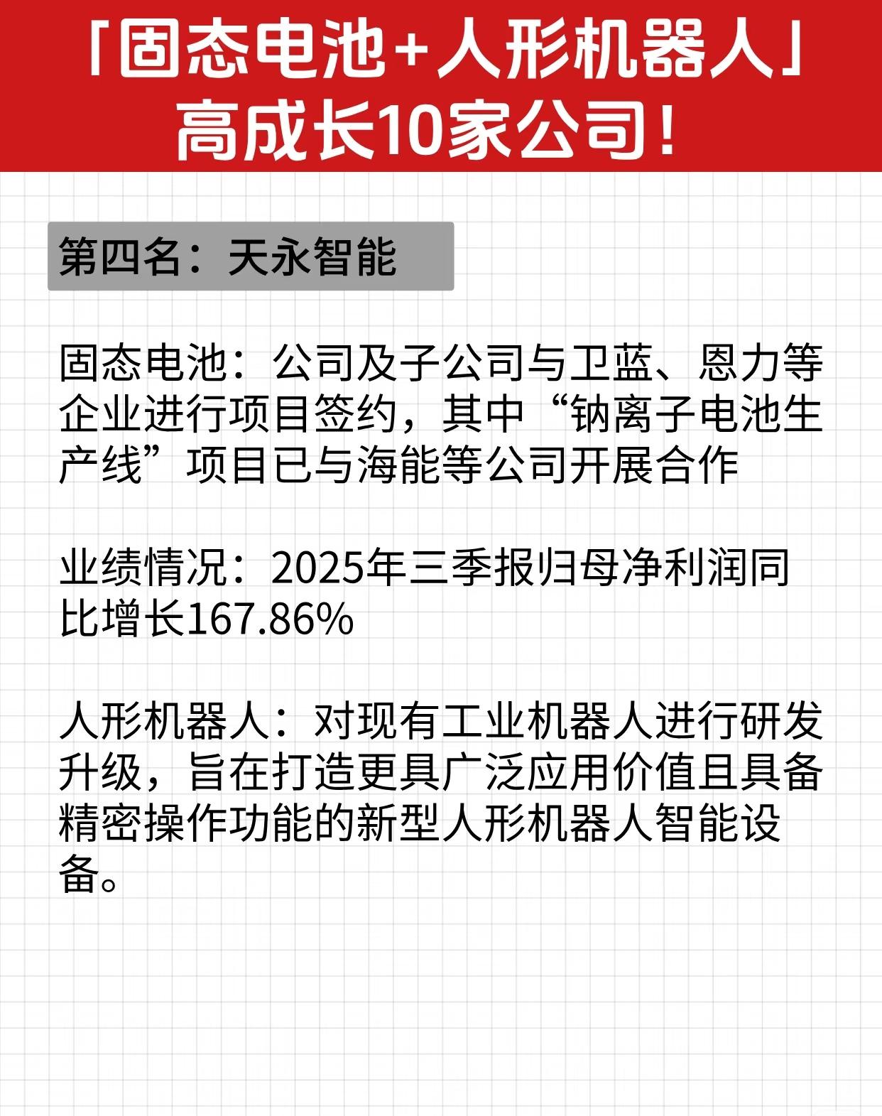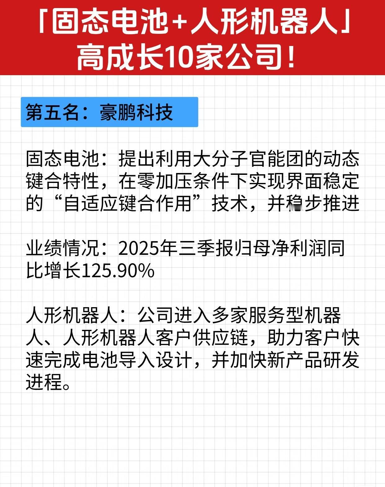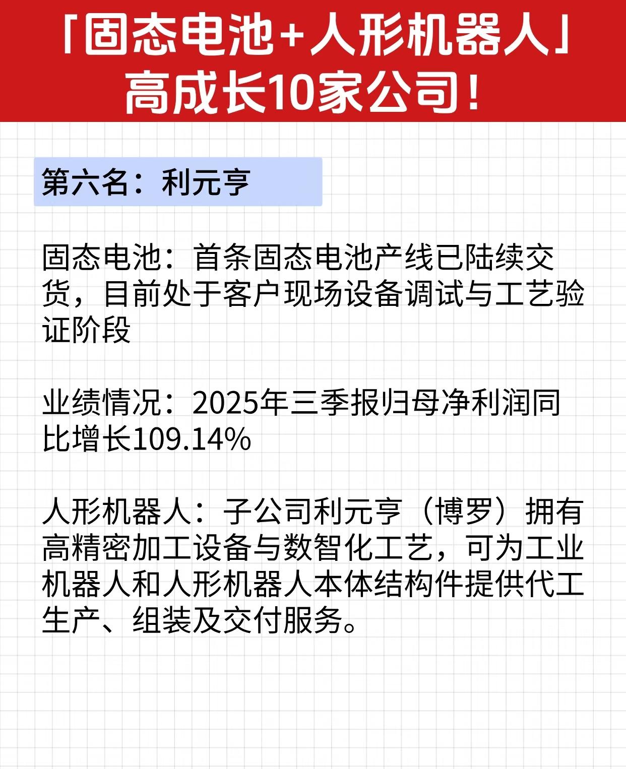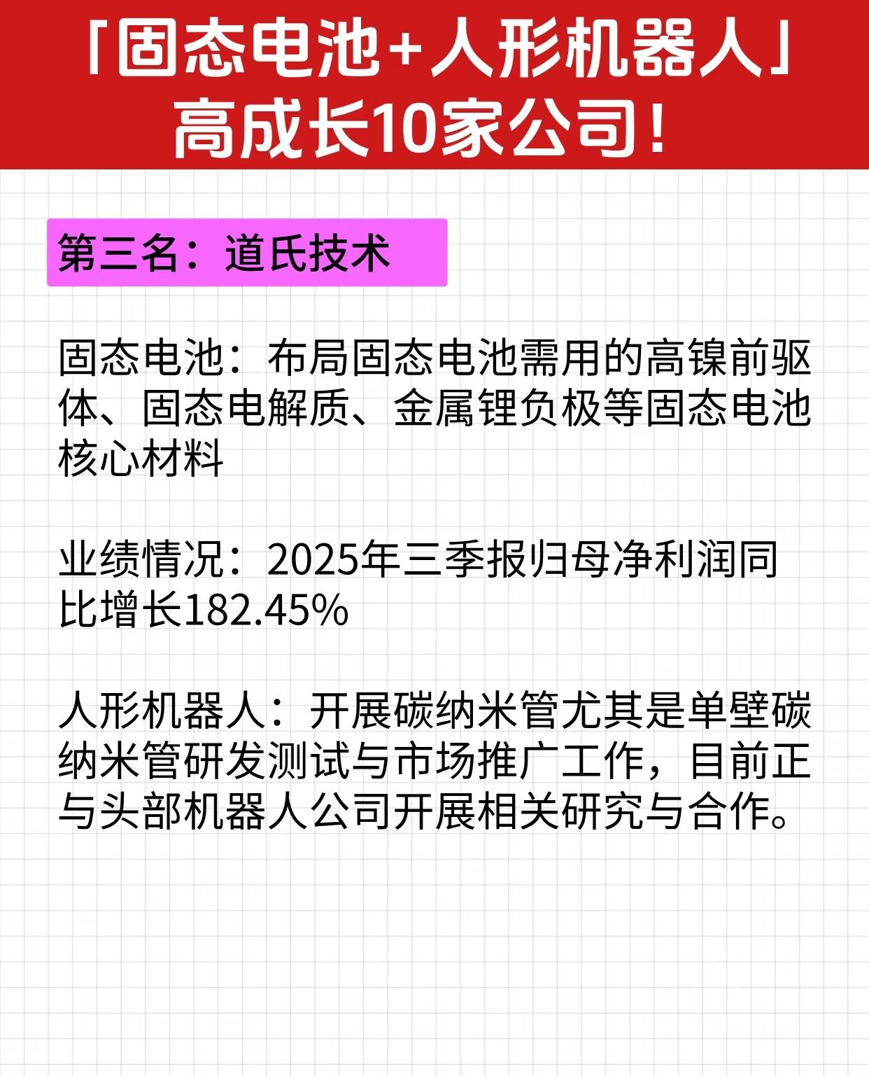 以下是关于“固态电池+人形机器人”高成长10家公司的综合介绍(收藏研究): 1. 第一名:楚江新材 - 固态电池:子公司顶立科技拥有固态电池电解质粉体制备用热工装备,为相关加工企业提供技术支持。 - 人形机器人:子公司鑫海高导是铜导体领域领先企业,已布局人形机器人相关铜导体产品,并实现向多家知名线束企业的批量供货。 - 业绩:2025年三季报显示归母净利润同比增长高达2089.49%,增速位居榜首。(提醒:当前公布三季报公司数量有限,样本较小,市场波动风险需警惕) 2. 第二名:远东股份 - 固态电池:积极布局全固态电池与锂离子电池前沿技术,推动全球圆柱电芯技术进步。 - 人形机器人:旗下人形机器人专用电缆产品已广泛应用于机器人及专精特新领域,并与优必选、智元等头部机器人企业达成战略合作。 - 业绩:2025年三季报归母净利润同比增长268.86%。 3. 第三名:道氏技术 - 固态电池:重点布局固态电池所需核心材料,包括高镍前驱体、固态电解质与金属锂负极等。 - 人形机器人:正开展碳纳米管(特别是单壁碳纳米管)的研发与市场推广,与头部机器人公司开展相关合作研究。 - 业绩:2025年三季报归母净利润同比增长182.45%。 4. 第四名:天永智能 - 固态电池:公司及子公司与卫蓝、恩力等企业签约合作,钠离子电池生产线项目与海能等公司开展合作。 - 人形机器人:在现有工业机器人基础上持续研发升级,目标是打造具备高精度操作能力的新型人形机器人智能设备。 - 业绩:2025年三季报归母净利润同比增长167.86%。 5. 第五名:豪鹏科技 - 固态电池:推进“自适应键合作用”技术,利用大分子官能团动态键合特性,在零加压条件下实现稳定界面,技术处于稳步推进阶段。 - 人形机器人:已成为多家服务型及人形机器人客户的供应链合作伙伴,助力客户完成电池导入设计与新品研发。 - 业绩:2025年三季报归母净利润同比增长125.90%。 6. 第六名:利元亨 - 固态电池:首条固态电池产线已逐步交货,目前正在进行客户现场的设备调试与工艺验证。 - 人形机器人:子公司利元亨(博罗)具备高精密加工与数智化工艺能力,可为工业及人形机器人结构件提供代工、组装及交付服务。 - 业绩:2025年三季报归母净利润同比增长109.14%。 7. 第七名:赣锋锂业 - 固态电池:多款固态电池样品已通过针刺及200°C热箱安全测试,首款500Wh/kg级10Ah固态电池已实现小批量出货。 - 人形机器人:孙公司赣锋电子研发的324Wh电池组具备自动校准功能,已应用于四足与人形机器人产品。 - 业绩:2025年三季报归母净利润同比增长103.99%。 8. 第八名:蔚蓝锂芯 - 固态电池:公司正积极推进固态及半固态锂电池研发,并已推出半固态锂电池产品。 - 人形机器人:旗下锂电池产品已应用于宇树机器狗及人形机器人等终端产品。 - 业绩:2025年三季报归母净利润同比增长82.05%。 9. 第九名:金发科技 - 固态电池:研发的低翘曲、低蠕变、高性价比材料已在液流与固态电池等核心部件中推广应用。 - 人形机器人:间接持股宇树科技,拥有人形机器人零部件相关材料解决方案,部分材料已实现批量供应。 - 业绩:2025年三季报归母净利润同比增长55.86%。 10. 第十名:扬杰科技 - 固态电池:在固态电池应用领域拥有相关产品与研发布局,有助于提升市场竞争力与份额。 - 人形机器人:部分产品可应用于人形机器人电机驱动及感知系统,但目前仍处于初期阶段,出货量较小。 - 业绩:2025年三季报归母净利润同比增长45.51%。 🔔 风险提示:目前公布三季报的公司仍为行业内少数,样本量较小,榜单仅涵盖部分企业,市场波动可能较大,请投资者注意风险。
