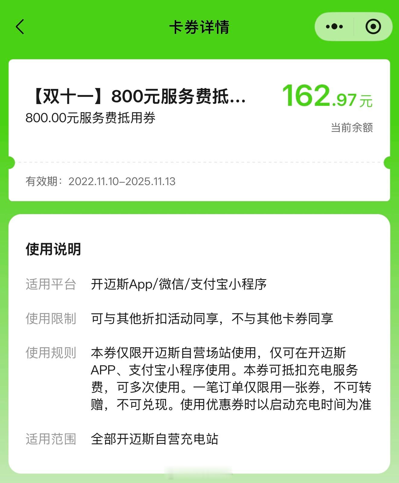 三年前双十一花 400 元买的开迈斯 800 元卡包,专门抵扣服务费来着。还有一周到截止日期,目前还剩 162 元,这肯定是花不完了。有谁需要,免费送了[doge]仅限开迈斯自营充电站,抵扣充电服务费,电费跟停车费自理。