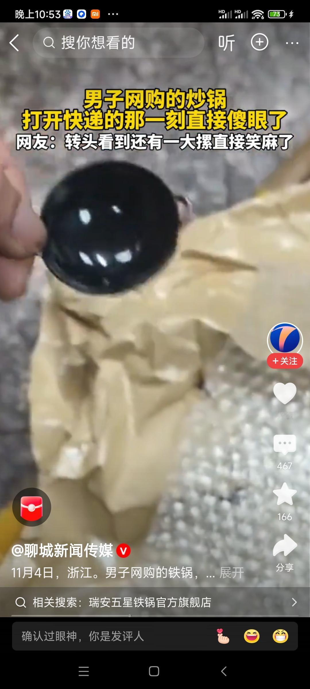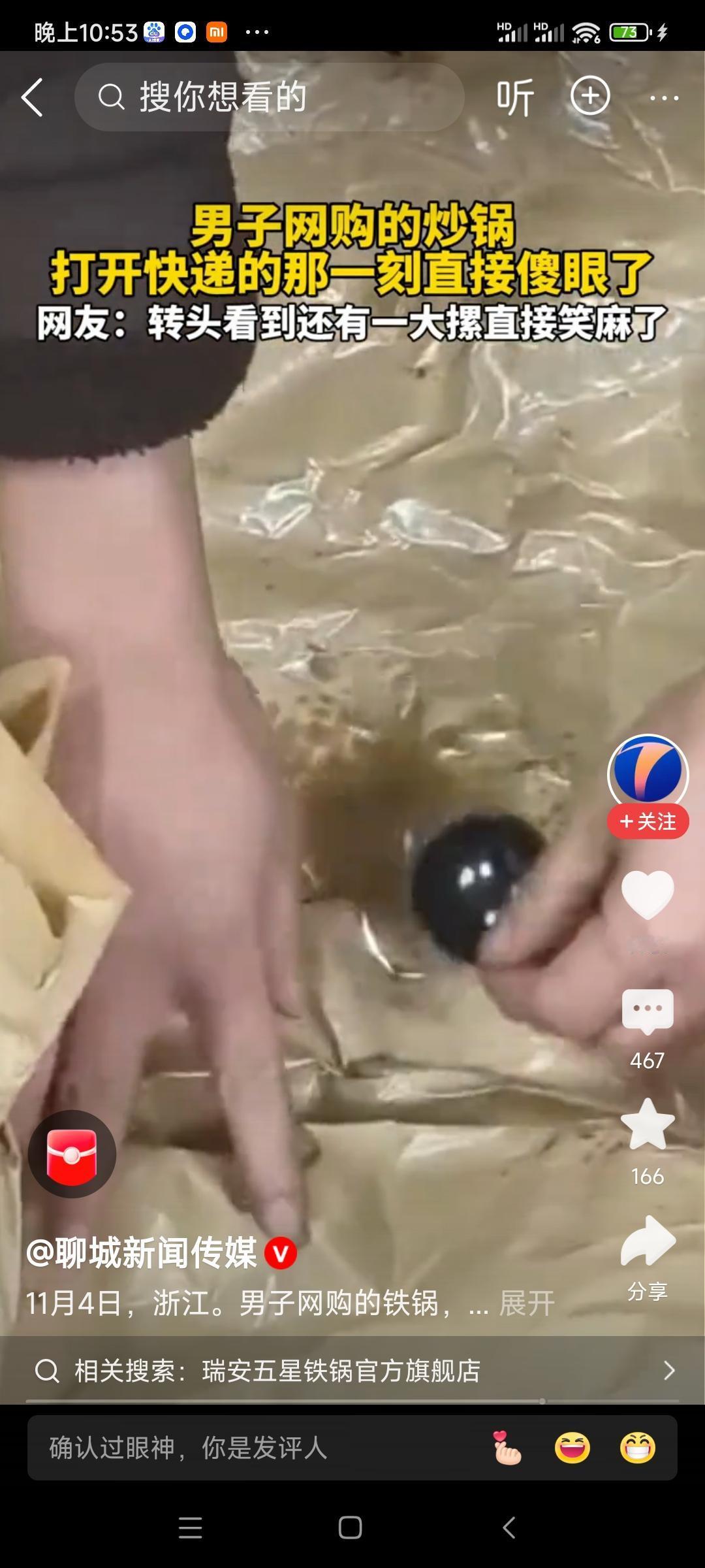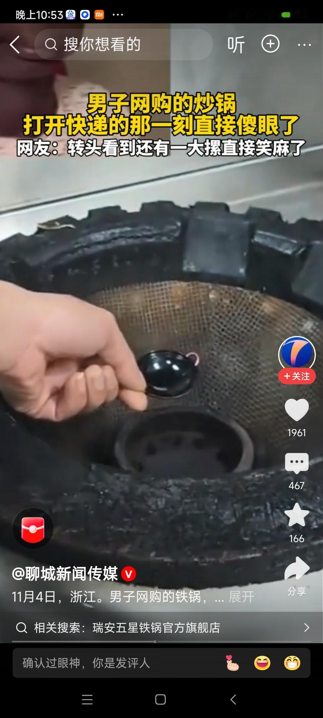 网购铁锅有感 网上欣购老铁锅,开箱一瞬傻了哥。 原期炊火烹香膳,怎料邮来尺寸