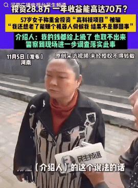 河南,57岁女子投资28.8万,以为一年收益能高达70万,老了还能赚个机器人伺候她,结果却不是她想的那么回事。介绍人:我的钱都给上级了,也取不出来。 据女子介绍,她投的是“高科技项目”,刚开始也是抱着半信半疑的想法投了2万,没想到过了没多久这2万就回本了。这让女子放心了不少,介绍人又让她去工作室听课,坐在台下听着台上的老师说着什么星光云、什么ai、连机器都用的起,还能让机器人伺候呢。 听到老师的讲课,让她又对这个项目信任了不少,毕竟现在大人小孩都知道ai、机器人这些。回家后她信心倍增,把家里的黄金项链、手镯全给变卖了,拿着这些钱给了上一级的人。本想着这下投了这么多,年底那不是稳稳的赚个七八十万的,没想到梦想破灭了。 这作事也是引起了网友的关注,有网友说:你要是刚开始就告诉她这可能是个骗局,女子可能也是不会信的。 也有网友说:之前刷到很多被骗的,看着很沉重,可这女子那句挣个机器人伺候我,看笑了。 这件事说到底还是贪婪惹的祸,很多老年人手上有了余钱,就是做点投资让钱生钱,可这正中骗子下怀。如果真的那么赚钱,那上家为什么不自己做。