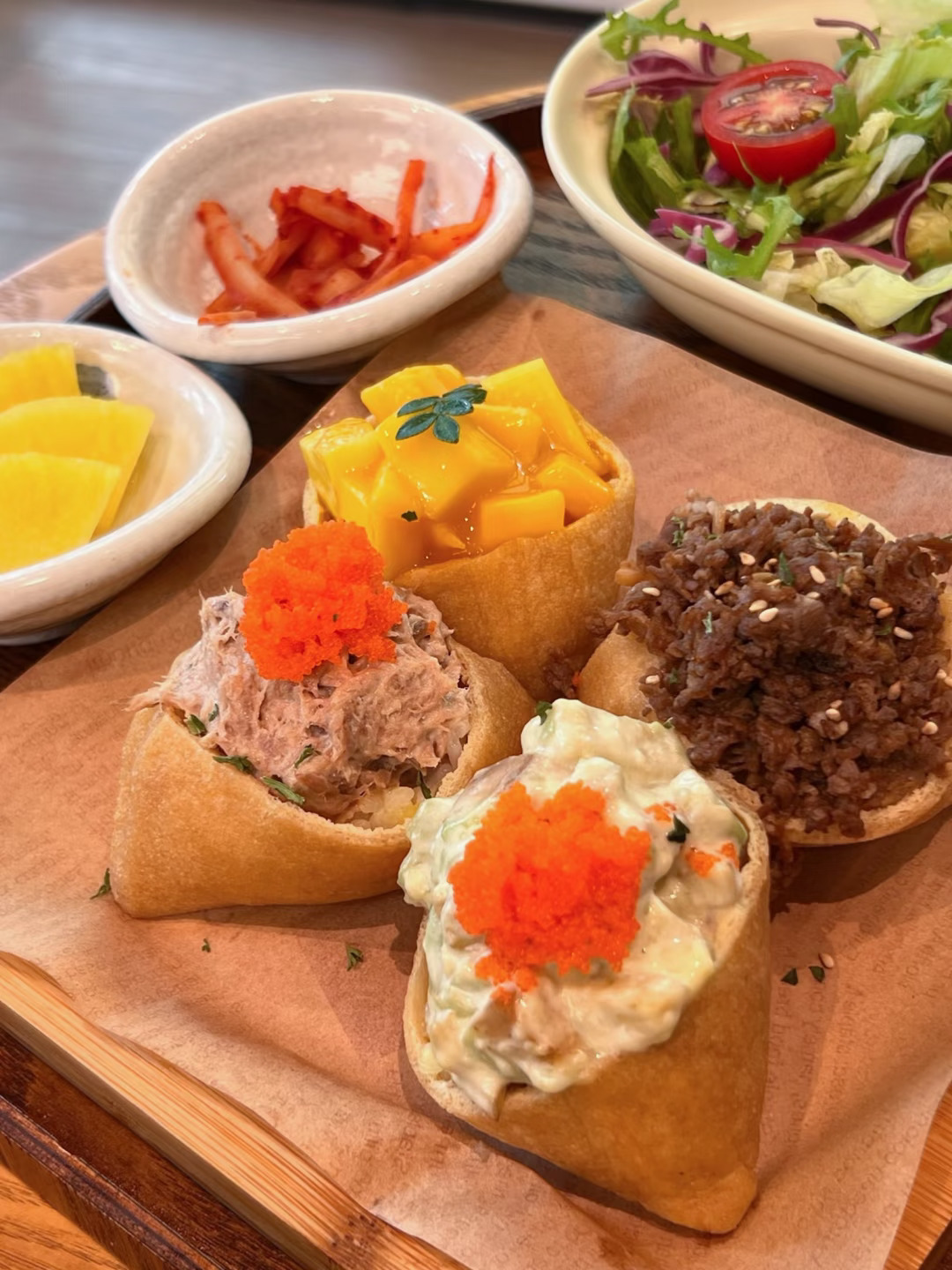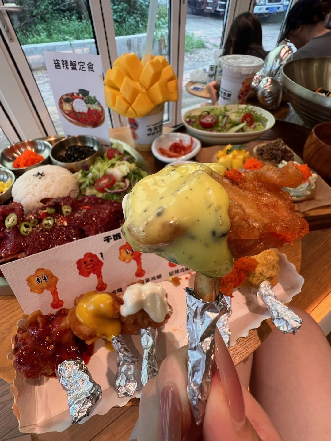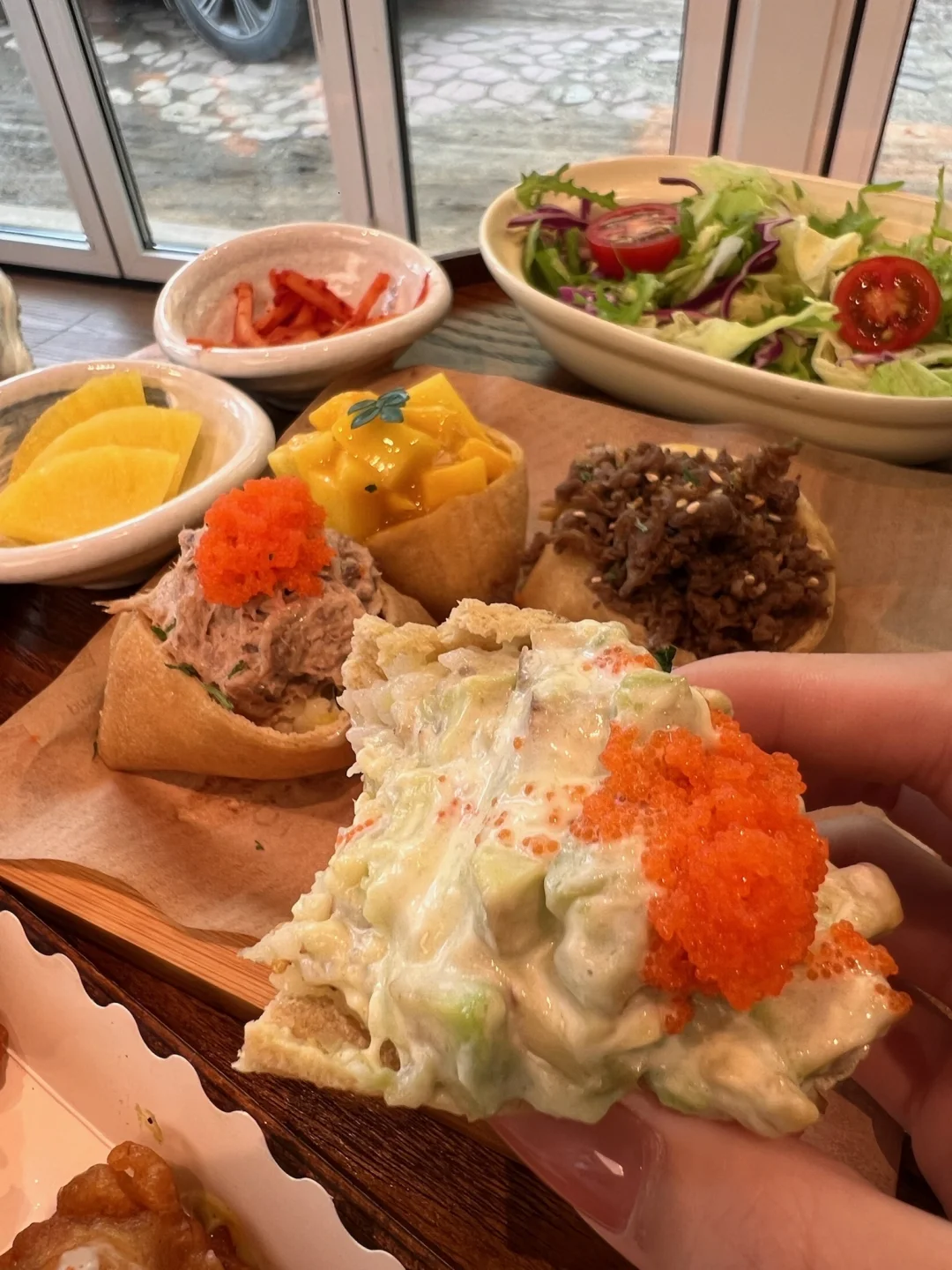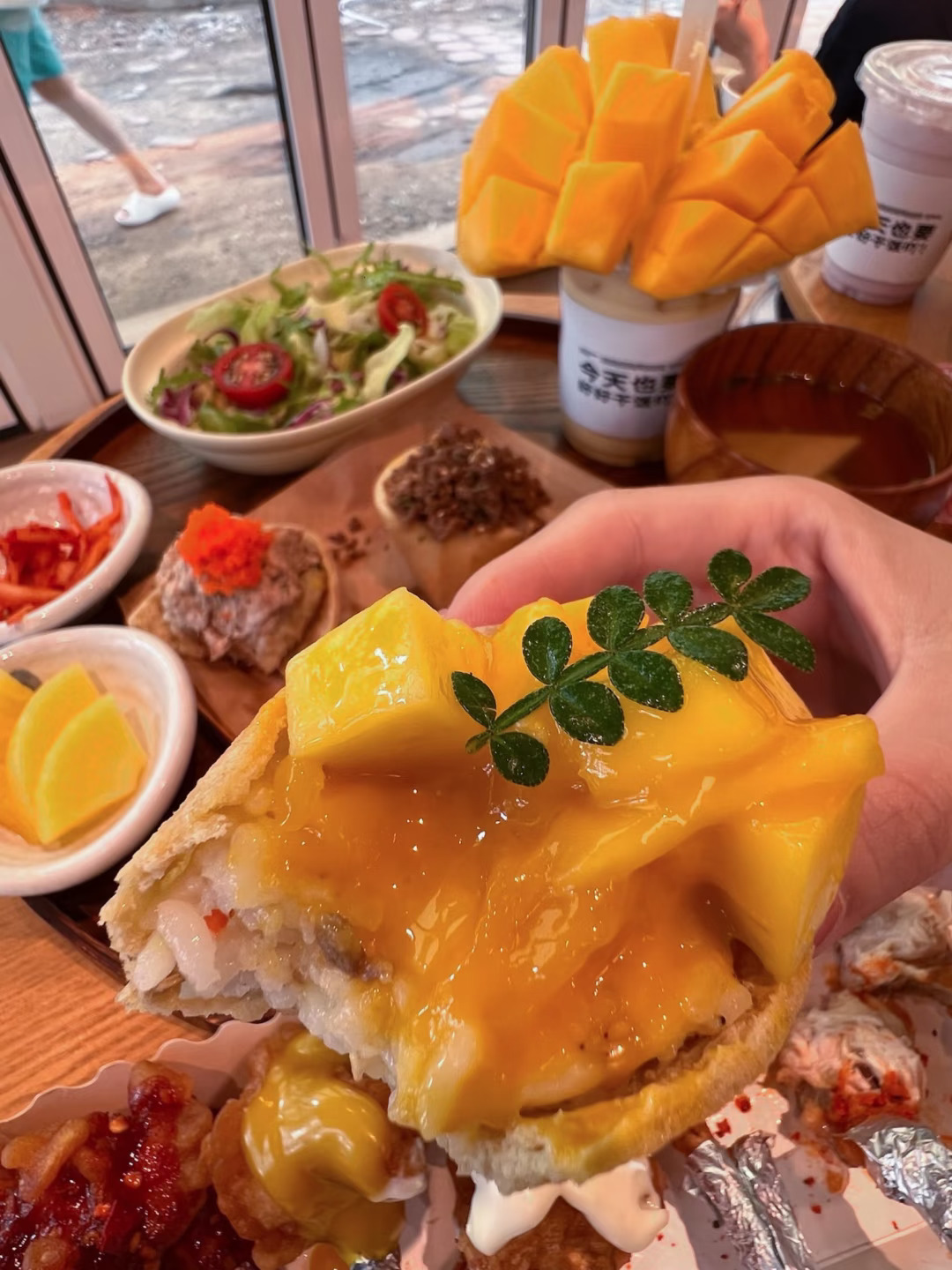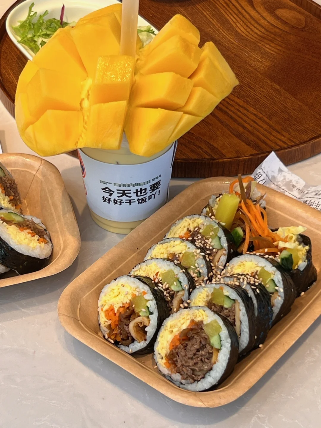 藏在西塔一个不起眼的街边,下沉式的温馨小店面积不大但是很延吉很治愈。。。。一直生意都hin好!! 烤牛肉、金枪鱼、六彩mini鸡腿、芒果冰奶都好好吃啊啊啊(尤其是山葵和雪花芝士的)每次去都要一口气吃好几个。香迷糊了。。!!是甜丝丝的咸香。。😭 而且人均30左右,也是真的hin便宜!! 西塔美食