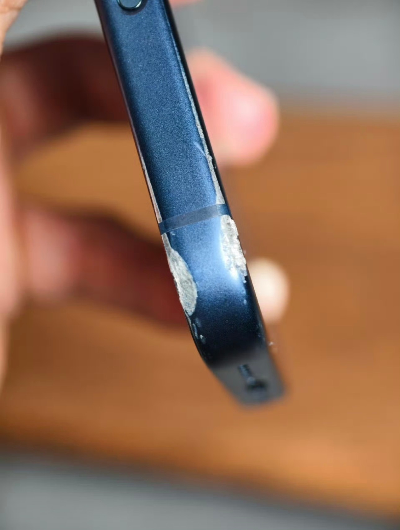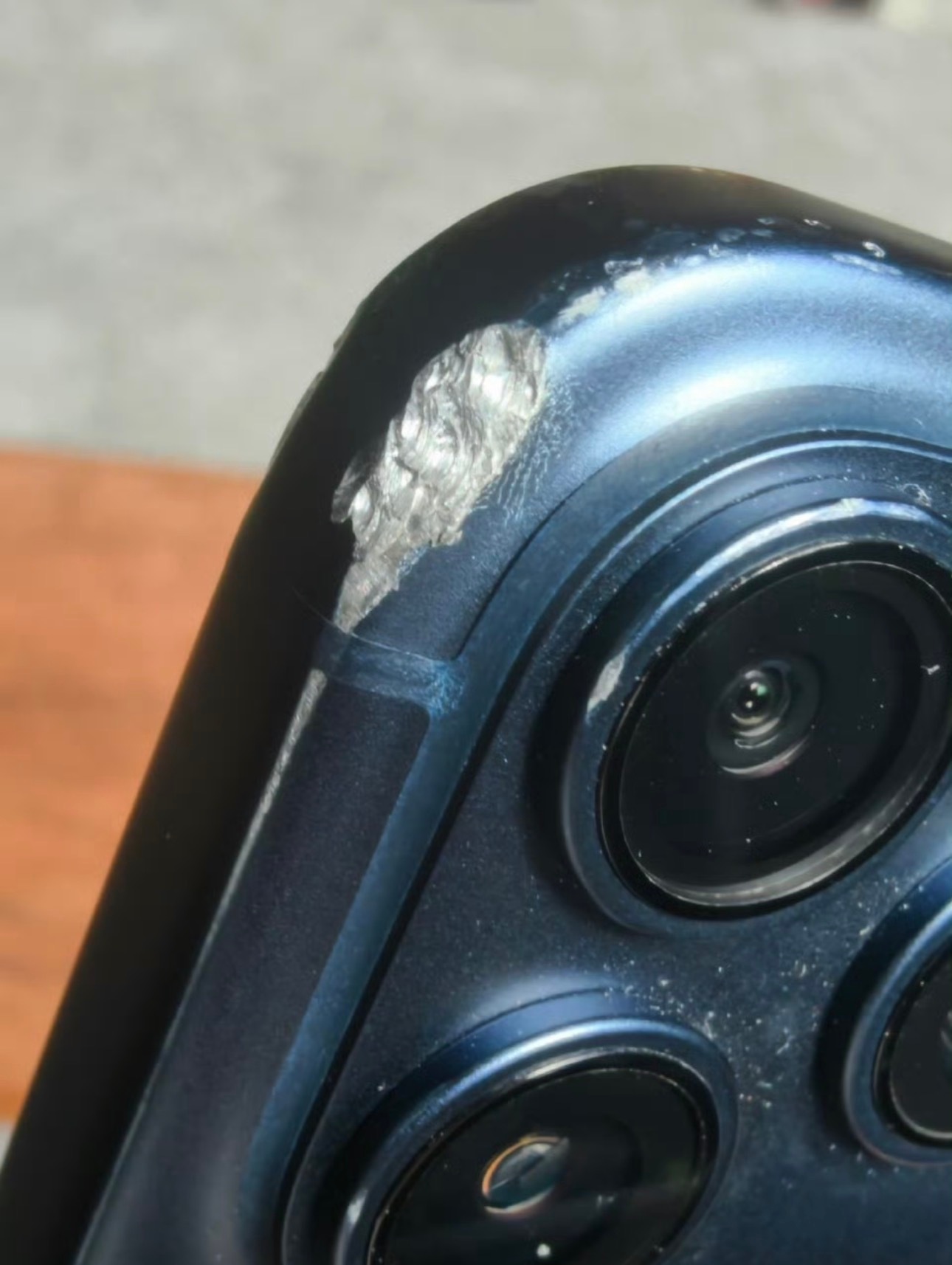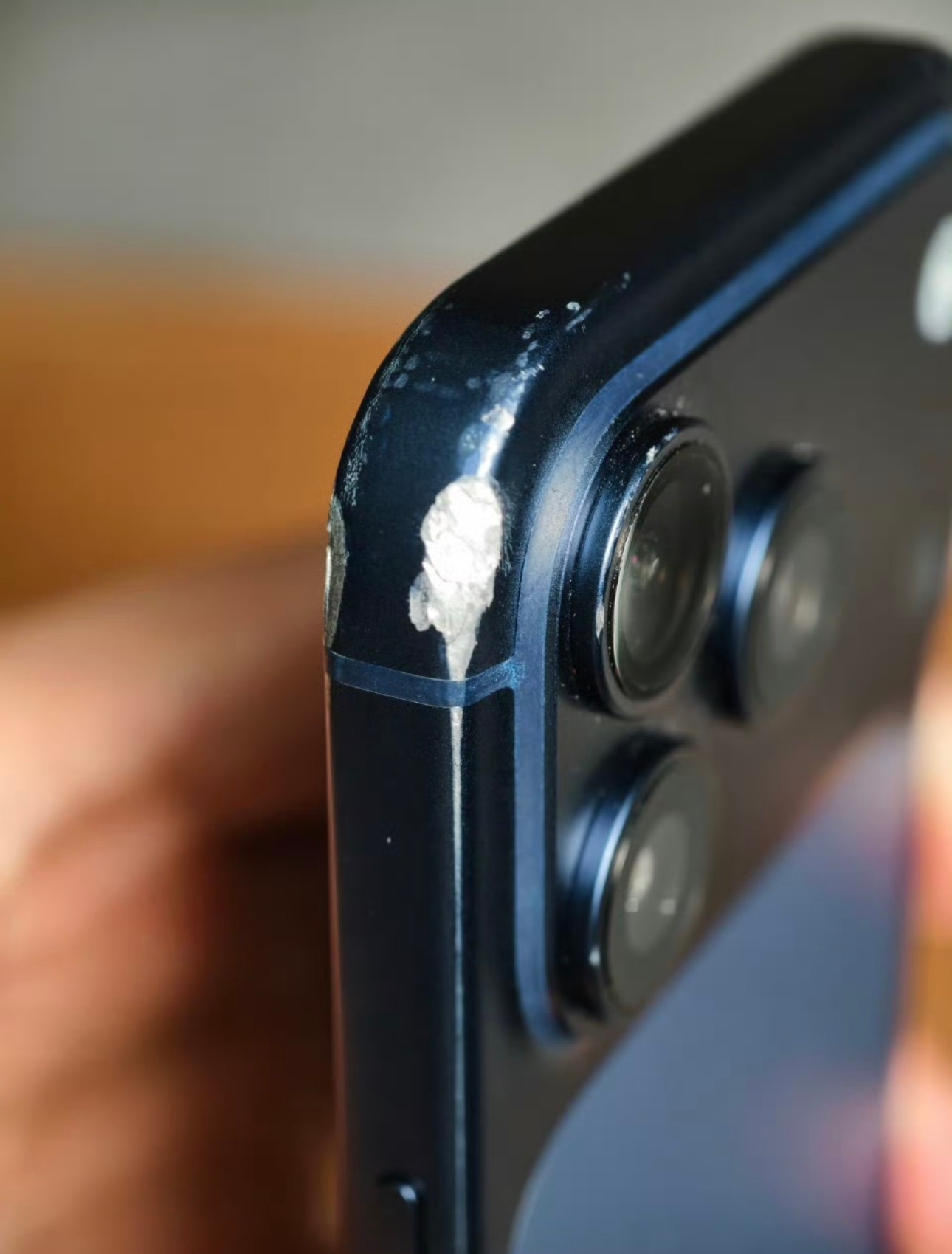 客户说从三楼摔下去的,一个17PM 国行 512就成这样了,外壳变形,屏幕内爆……