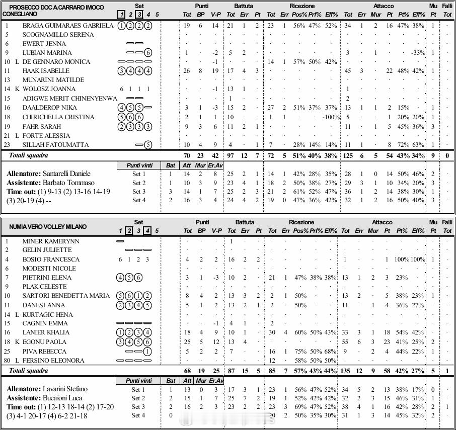 【意甲女排科内3-1力克米兰 哈克26分埃格努25分】国际排坛战报速递 11月5日,意甲女排第四轮补赛,科内利亚诺主场3-1(25-17/23-25/25-23/25-21)力克米兰,报了超级杯的一箭之仇。哈克26分、加比19分、西拉10分、MVP为德吉纳罗,埃格努25分、拉涅尔18分。