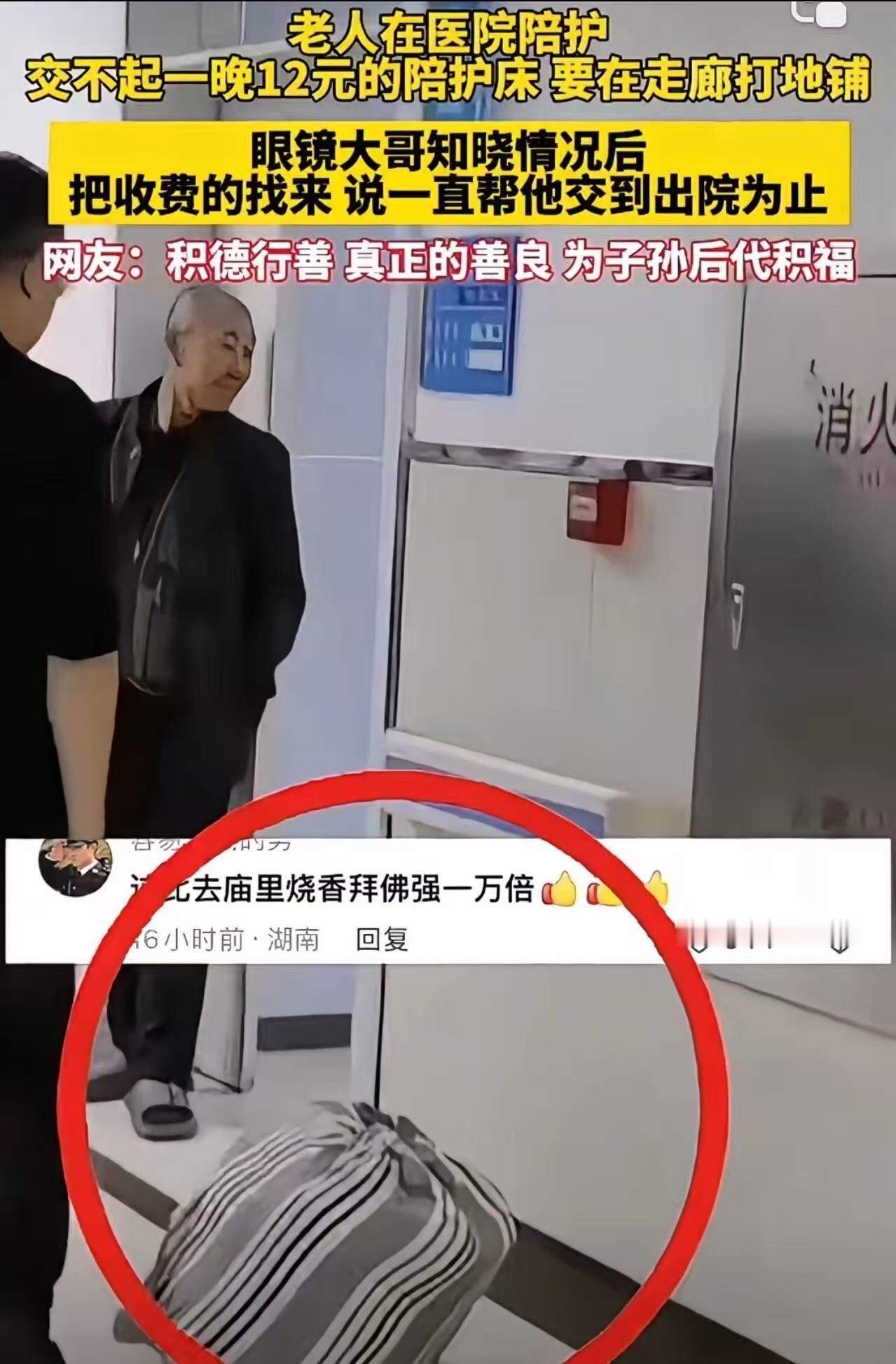 老人在医院陪护,交不起一晚12元的陪护床,打算在走廊打地铺。一位戴眼镜的大哥看到后,一番举动让老人泪目!网友:这才是真正的善良,比去庙里烧香拜佛强一万倍! 在这个快节奏、物欲横流的时代,善良似乎变得越来越稀缺。而就在昨天,一幕温暖人心的场景再次证明,善良其实就藏在我们身边,等待被点亮。 老人孤身一人在医院,面对高昂的陪护床费,心中满是无奈。每天奔波,心如乱麻,只为多陪伴一会儿心爱的亲人。然而,12元一晚的陪护床,对于许多普通家庭来说,却是一笔不小的负担。老人打算在走廊打地铺,用最朴素的方式守护亲人。这样的场景,让人不禁心生怜悯,也让人深思:在这个物质至上的社会,我们是否还记得那份最纯粹的善意? 就在老人准备就寝时,一位戴眼镜的大哥走了过来。他没有多言,只是默默地从包里拿出一张票,递给老人。那是一张陪护床的预约券,价值12元。老人一开始还以为对方在开玩笑,直到看到那份真诚的眼神,心中涌起一股暖流。大哥说:“老人家,您不用在走廊打地铺了,这个给您,用它陪伴您的亲人吧。”简单的话语,却像春风拂面,瞬间融化了老人心中所有的孤独与无助。 这个瞬间,被旁边的医护人员用手机记录下来,上传到网络后,瞬间引发了热烈的讨论。网友们纷纷点赞:这才是真正的善良,比去庙里烧香拜佛强一万倍!有人感叹:“我们都在追求大善大德,却忽略了身边那些微小的善意。”有人留言:“这才是人性最美的一面,温暖了彼此,也温暖了这个社会。” 其实,这样的善举不止一次出现。无数普通人用行动告诉我们,善良不需要多么宏伟的言辞,只需一个微笑,一次帮助,就能点亮他人心中的希望。这种善良,是真正的力量,是推动社会向前的温暖力量。 我们常说“善有善报”,但更重要的是,善良本身就是一种价值,一种生活的态度。或许我们无法改变整个世界,但我们可以从身边的小事做起。就像那位大哥一样,或许只是一个简单的举动,却让一位老人重新感受到这个社会的温暖和关怀。 这个故事也提醒我们,每个人都可以成为那束光。在我们忙碌、焦虑、迷茫的时候,不妨停下来,想想身边需要帮助的人。也许,一个善意的眼神,一句暖心的话语,就能让对方重新找到前行的力量。 善良,不是稀罕的神迹,而是我们每个人都能拥有的品质。它不需要轰轰烈烈的宣扬,只需要在日常生活中,用心去感受、去行动。因为,真正的善良,是在无声中温暖人心,是在平凡中彰显伟大。 让我们都成为那个传递温暖的人吧。不为别的,只为这个世界多一份善意,多一份希望。毕竟,善良的力量,远比我们想象的更为强大,它能穿越寒冬,点亮黑夜,照亮每一个需要帮助的灵魂。 这,就是我们这个时代最美的风景。亲人住院陪护 医院陪护困境 住院陪护费