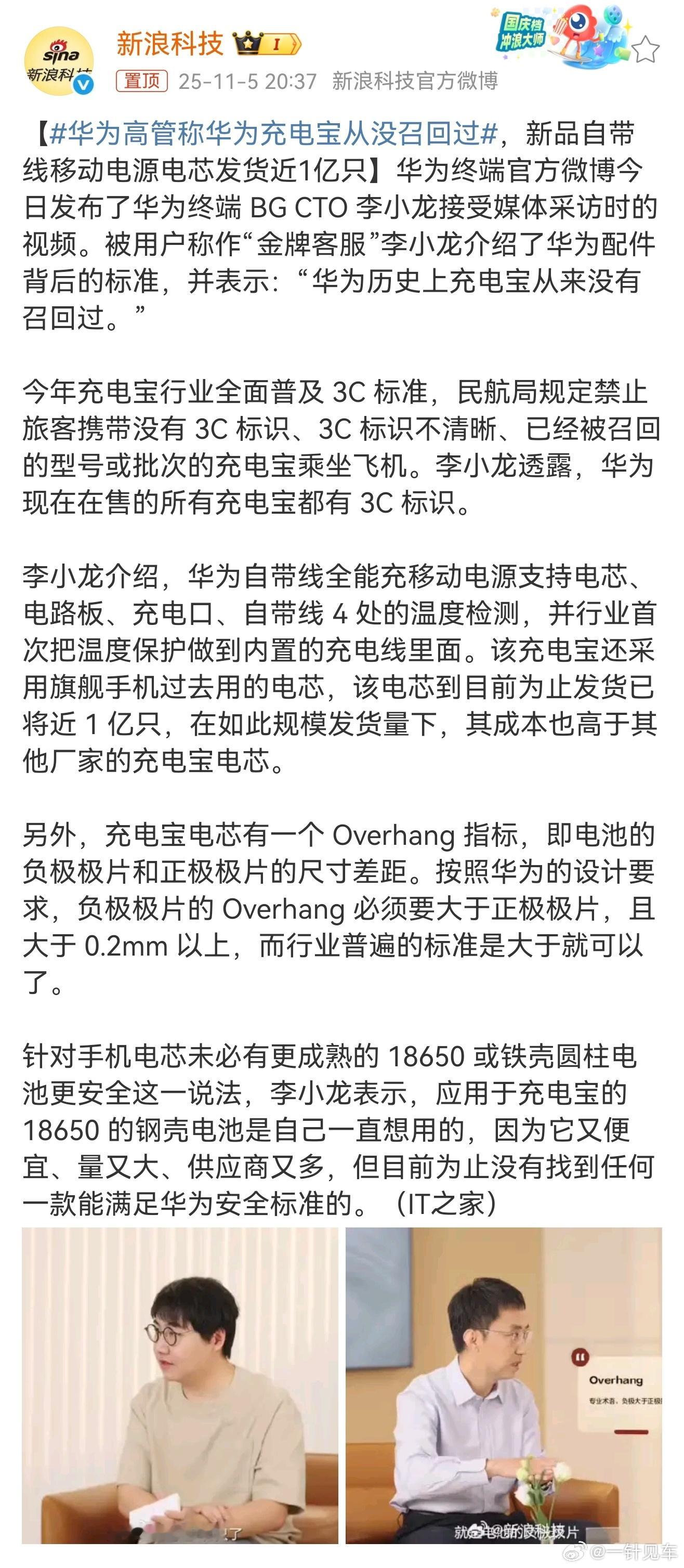 华为高管称华为充电宝从没召回过李小龙介绍了华为配件背后的标准,并表示:“华为历史上充电宝从来没有召回过。”[作揖][作揖][作揖]