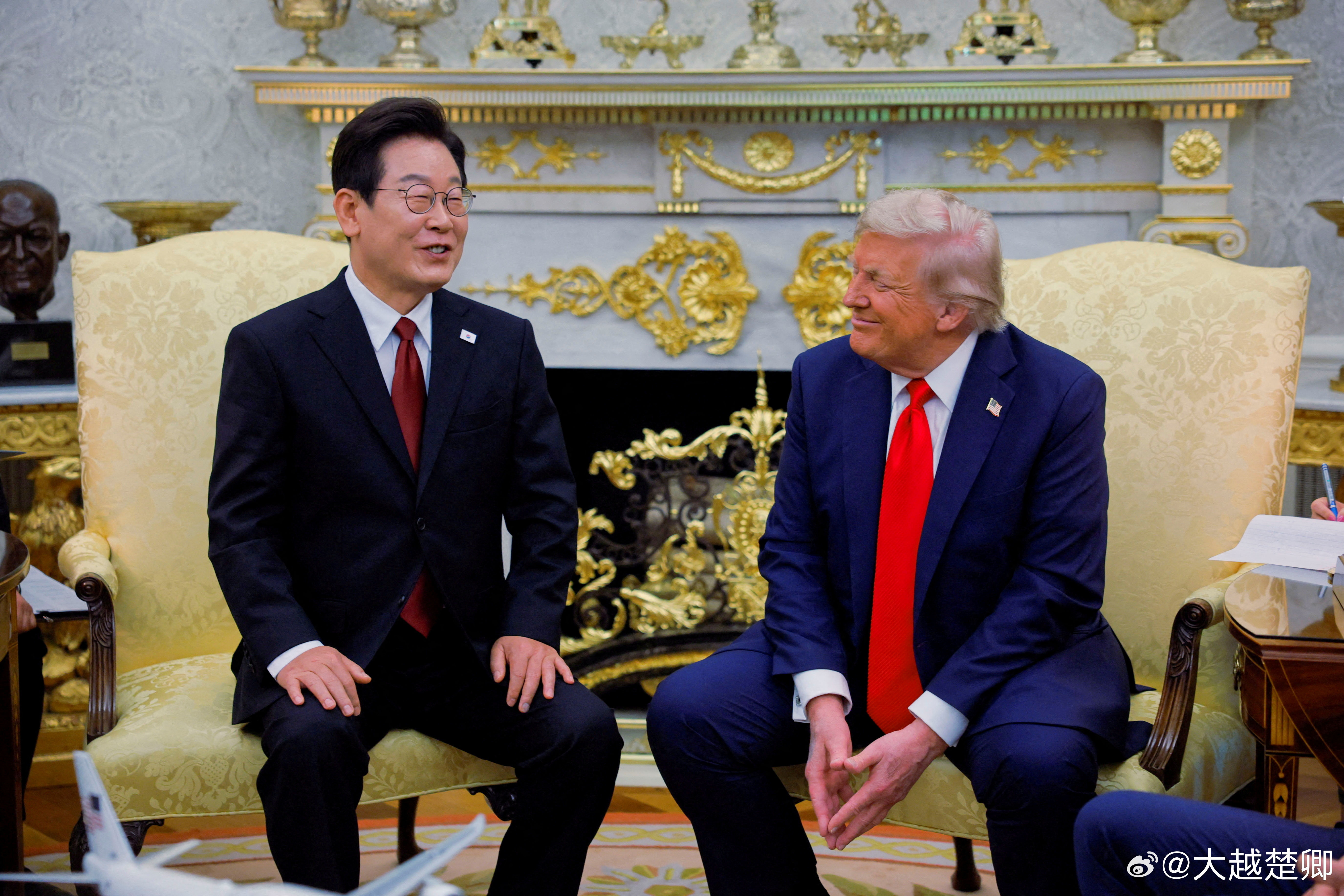 特朗普访问韩国。韩国向特朗普颁授最高级别荣誉勋章:无穷花大勋章。李在明向特朗普赠