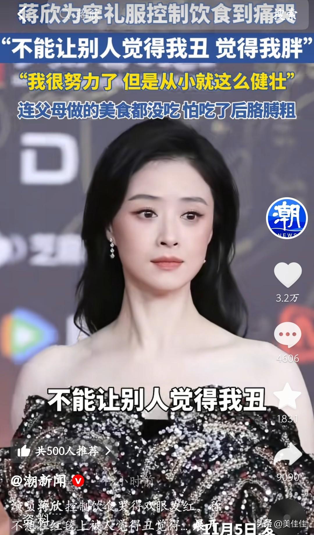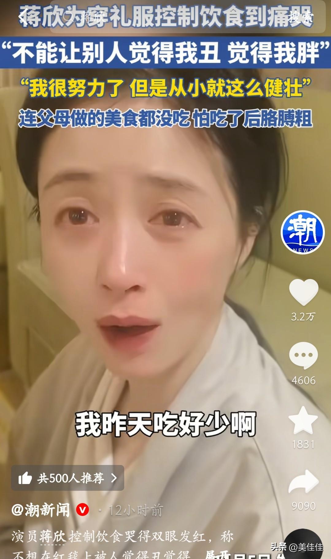 谁看蒋欣哭着减肥这段不跟着破防啊!42岁的姐素颜对着镜头抹眼泪,边哭边吐槽:“我昨天几乎没吃东西,爸妈都不信我吃饱了,全靠演的!” 就为了穿礼服好看,怕别人说胖说丑,硬生生扛着饿搞“16+8轻断食”,每天只能吃点“绿化带”似的菜叶,连草莓都只敢吃尖尖。 可她天生大骨架,再怎么减胳膊还是结实,自己都自嘲“胳膊能拧过大腿”。想想她以前被嘲“虎背熊腰”,现在为了角色和镜头,三年减20斤,拍戏间隙都在做平板支撑,饿到情绪崩溃也舍不得多吃。 女明星的光鲜背后,全是咬牙坚持的心酸。明明健康圆润时也很美,却要被审美绑架逼自己挨饿,真的又心疼又共情!希望大家对身材多些包容,毕竟健康比纤瘦更重要啊!