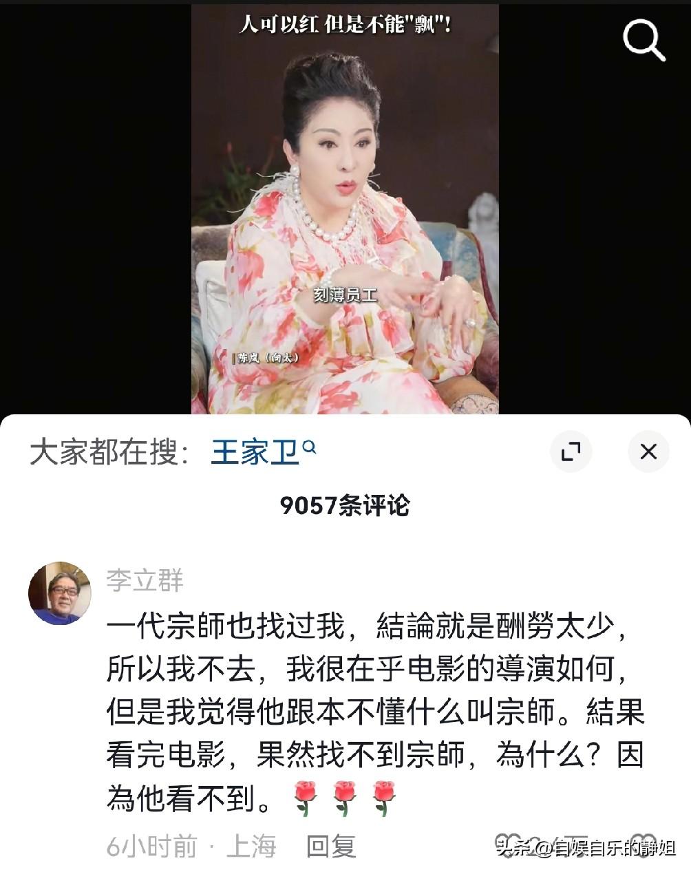 在向太发布的关于王家卫的评价视频中,演员李立群现身评论说当初王家卫拍摄《一代宗师》的时候曾找过他,但最后因为王家卫给的片酬太低了他没去。 而在向太的视频中,向太也确实曾提到说王家卫自己虽然很有钱,但他给演员开的片酬却很低且还需要演员空出好长一段时间的档期。 演员李立群在评论中说当初他之所以拒绝《一代宗师》,除了片酬低外,还因为导演是王家卫才拒绝的。 演员李立群曾饰演过《半生缘》中的祝鸿才(简直童年阴影[笑哭]),《温州一家人》里饰演周万顺,《黄金瞳》里饰演德数等等,这人虽然演技还不错,但……