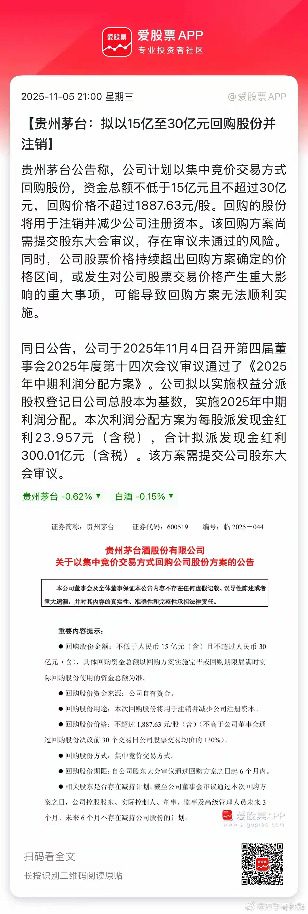 茅台又出手了,15亿至30亿元回购股份并注销,回购价格不超过1887.63元!对市值1.78万亿的茅王来说,这点回购金额少了点,但总归是好事吧。