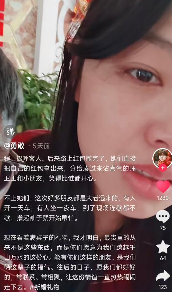 河南,婚礼结束后新郎正在数朋友送的礼金,突然被新娘叫到房间,进去一看新娘已经哭成了泪人,问原因也不说,只递过来一个小礼盒,新郎打开一看也被深深触动,抱着新娘哭了起来。 原来,这个礼盒正是新娘两个朋友送来的礼物,里面一看,里面除了一个洗面奶,还有一个偷偷塞进去的红包,可是明明两个朋友早就送过礼金和礼物了。 这时新娘给新郎看了一段跟朋友的聊天记录,两个朋友走之前跟新娘说:怕买的礼物不喜欢,不如你自己挑,当时新娘正忙着收拾新家,也就没在意,现在才明白这句话真正的含义。 新娘想着这这个不自觉的就哭了,这两个朋友都是从外地赶过来了,下车后饭都没吃就过来帮忙,帮忙给新娘收拾房间,贴喜字,一边忙还要一边处理工作,婚礼当天更是主动当起了司仪,忙着招呼客人给新娘化妆,还把自己的钱拿出来给小朋友们发红包,就像自己结婚一样高兴。 新郎知道两个朋友的事情后,也大为触动,不只是她们,还有很多朋友都是从五湖四海而来,到现场之后连歇都不敢歇,就帮忙干活,有这些好朋友真是一生的幸运,也暗自决定,等朋友们都结婚时,也要像今天一样,回报给她们。 看了这两个朋友经历,真的为这份纯粹的友谊而感动。 最贵重的礼物,从来不是钱而是这份愿意为你帮忙的心,有这样的朋友真的是一生的幸运和福气,感情中最重要的就是双向奔赴,你为我忙前忙后,我也要为你赴汤蹈火,人生最宝贵的感情莫过于此了。