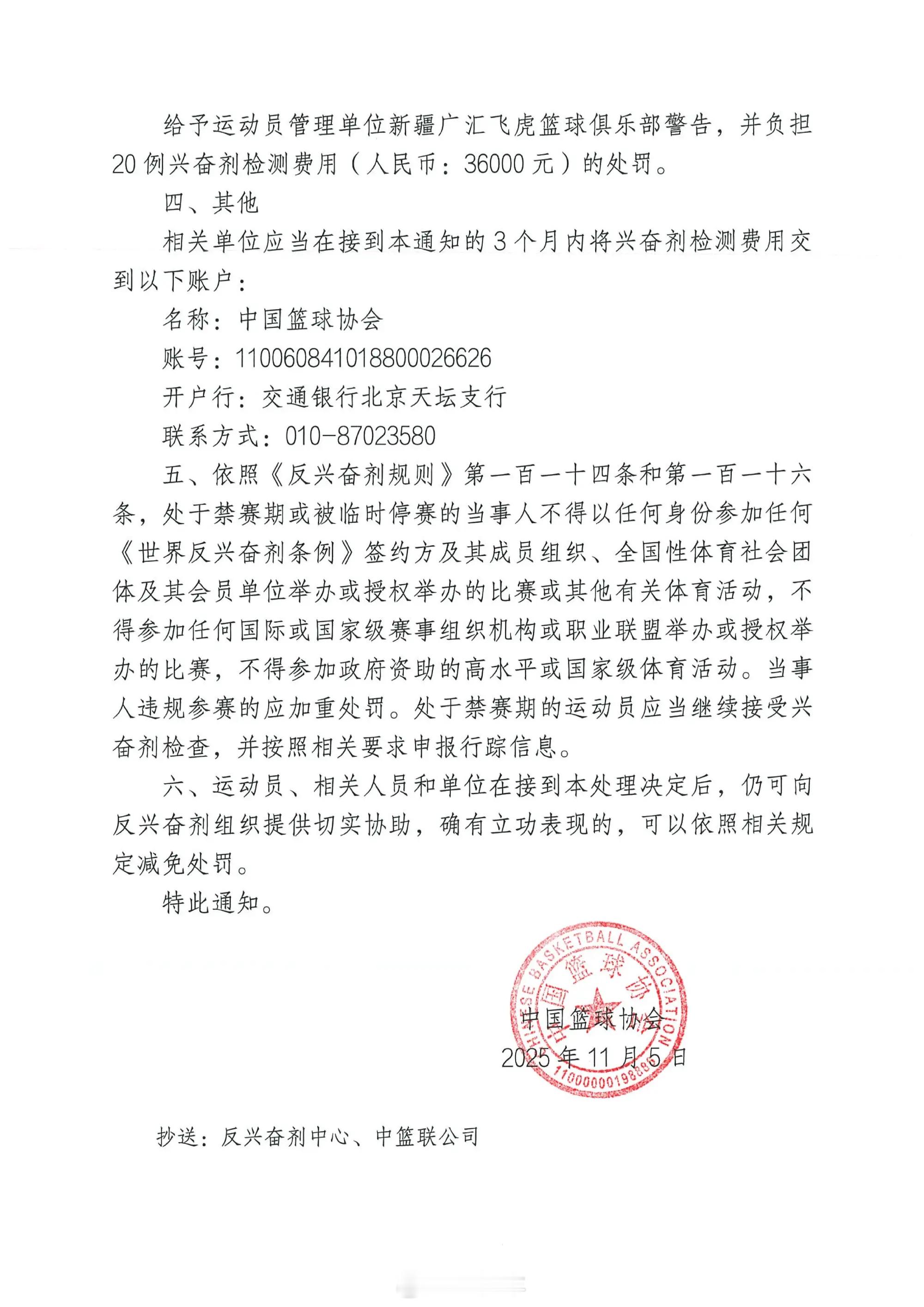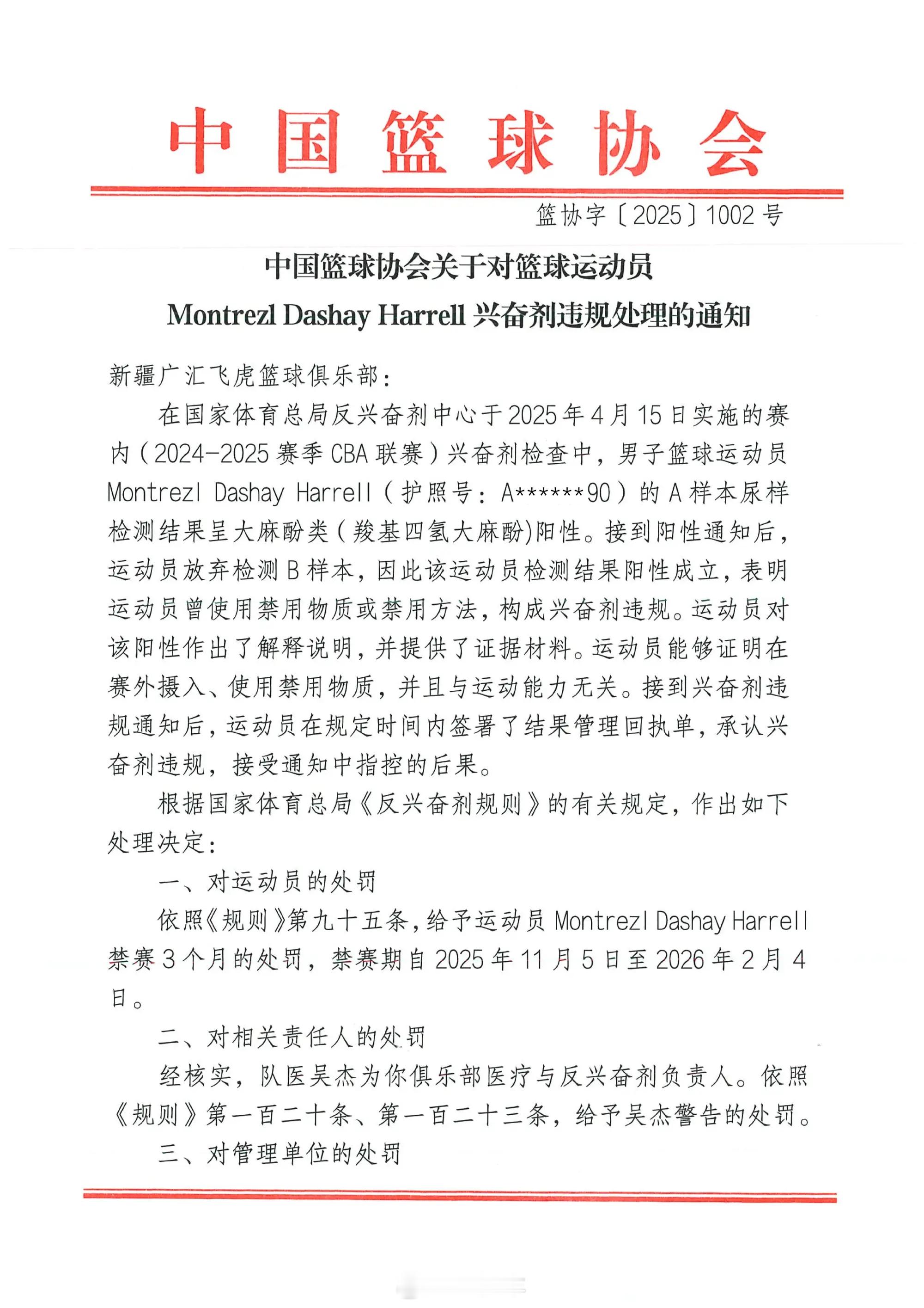 中国篮球协会发布通知,前新疆男篮外援哈雷尔的A样本检测呈大麻酚类阳性,且其放弃检测B样本,违规成立,被禁赛3个月(2025年11月5 日至2026年2月4日);新疆男篮俱乐部医疗与反兴奋剂负责人吴杰被警告处;新疆男篮被警告且需承担 20例兴奋剂检测费用36000元。哈雷尔因兴奋剂违规被禁赛3个月 金秋观赛季