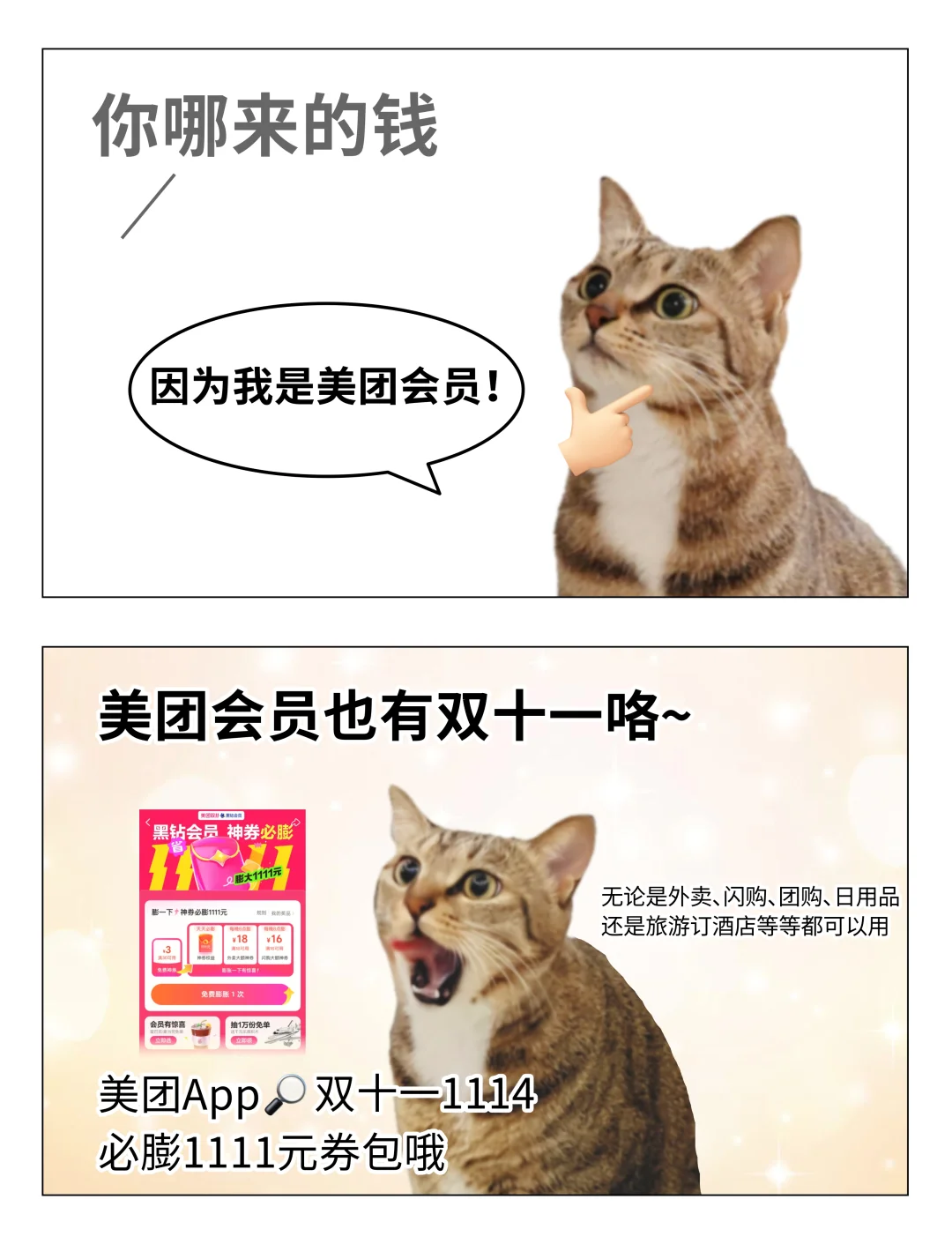 朋友:我好难过 我:别难过 朋友:我好生气 我:别生气 朋友:我好想哭 我:别哭 朋友:我好穷 我:别穷... 过两天带你出去吃大餐!跟你说美团会员现在有双十一了,美团App🔍【双十一1114】,必膨1111元券包哦~现在就可以开始囤券,11.8日-11日就可以使用啦,外卖、闪购、团购、日用品以及旅游订酒店等等几乎是生活场景全覆盖! 所以别不开心啦,我们一起用美团出门吃吃喝喝玩玩乐乐吧! 美团会员双十一还不用凑复杂满减,轻松省钱更简单!另外10.31-11.11,参与美团会员集卡活动,还能抽免单!以及各种实物好礼诶!我勒个豆,这个双十一真的太幸福了! 抽象朋友安慰朋友搞笑精神状态当代年轻人表情包内容过于真实闺蜜梗图猫吸猫美团会员美团会员双十一