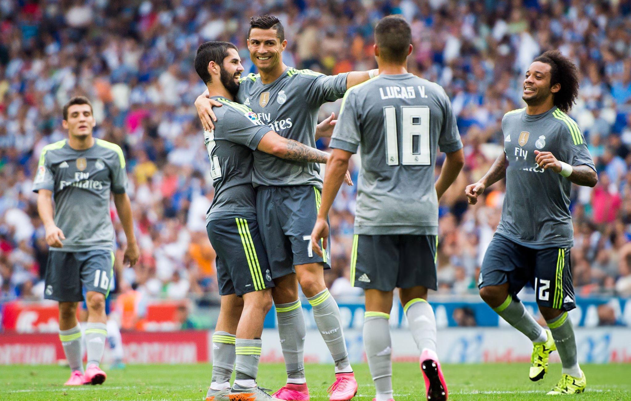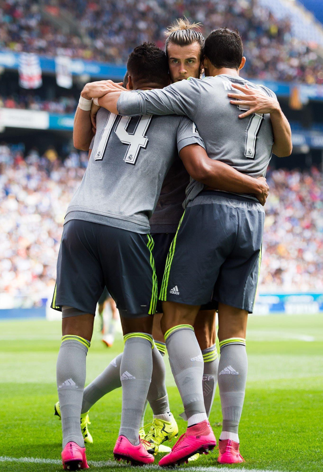 C罗[超话]c罗15-16赛季灰色客场球衣进球后被大家搂抱,拉莫斯和贝尔抱得