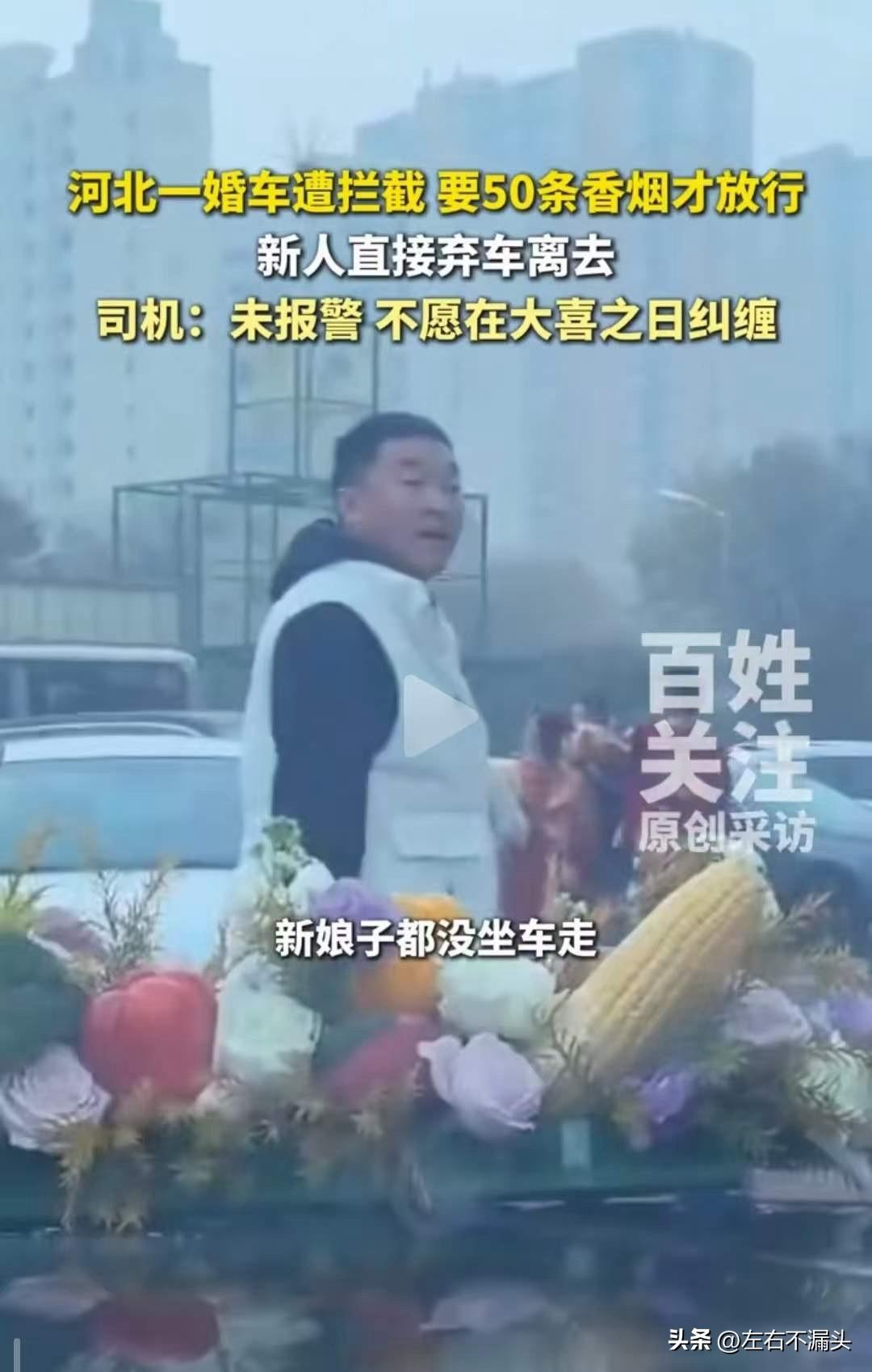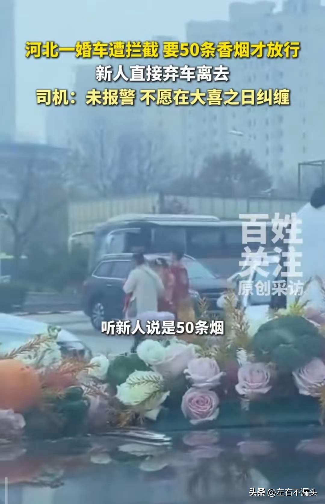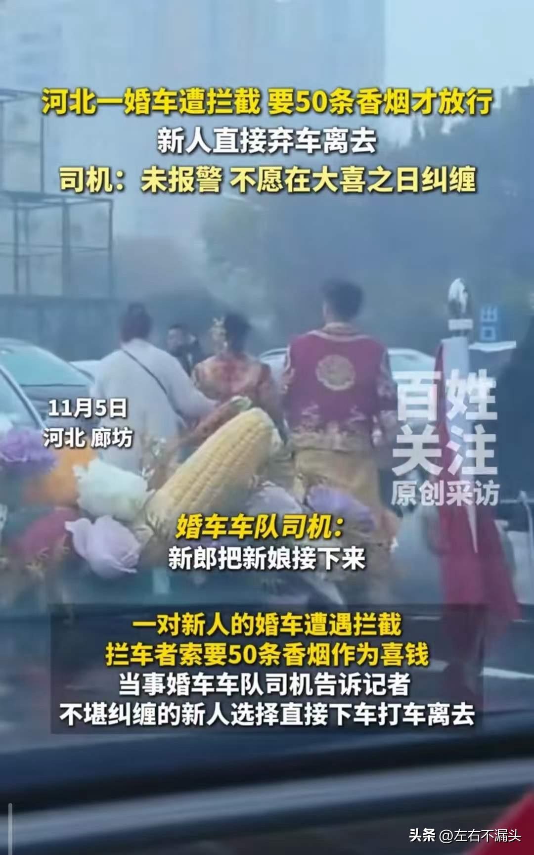 必须严惩!河北,一对新人结婚,婚车遭拦截,被索要50条香烟!!!新人不堪纠缠,打车离去!婚车司机:被堵了1个多小时!网友:50条香烟,已经够刑罚了,虽然构不成抢劫罪,我觉得够敲诈勒索罪,以婚车不让过为由实施勒索钱财之事! 必须严惩!河北,一对新人刚刚步入婚礼的喜悦,却遭遇了令人愤怒的“拦路抢劫”。就在他们的婚车队伍缓缓前行时,一伙不明身份的人突然出现,将道路堵得水泄不通。面对着无奈的等待,新人们心中充满了焦虑与不安,然而更令人震惊的是,他们竟然被索要了“50条香烟”作为“通行费”。 这场突如其来的“勒索”事件,让原本应该充满幸福的婚礼变成了一场令人愤怒的抗争。司机无奈地描述:“被堵了一个多小时,来回折腾,心情都快崩溃了。”而网友们的评论更是火爆:“50条香烟,已经够刑罚了!虽然不能算抢劫,但绝对属于敲诈勒索。”有人愤怒地表示:“这就是变相的勒索,婚车不让过,居然还要钱,这简直是无耻的犯罪行为!” 这起事件背后折射出的是一种令人担忧的社会现象:一些人为了所谓的“利益”,竟然可以无视法律底线,采取威胁、恐吓的手段。更让人心寒的是,面对弱势的新人,他们没有退缩,而是选择了“打车离开”,彰显出他们的无奈与坚强。 这也引发了公众对“勒索”与“敲诈”界限的讨论。有人说:“50条香烟,虽不构成抢劫罪,但已经严重触犯了敲诈勒索的法律底线。我们不能容忍这种歪风邪气,要用法律的武器保护普通百姓的权益。”也有人呼吁:“相关部门必须加强打击此类违法行为,还给我们一个安全、和谐的社会环境。” 然而,更深层次的问题在于:在这个社会,法律的威慑力是否足够?那些无视法律、肆意侵害他人权益的人,又该如何被惩治?这起事件提醒我们:每个人都应成为法律的守护者,而不是任由不法之徒肆意横行。我们需要的是制度的完善、执法的刚性,以及全民法律意识的提升。 面对这样的事件,作为普通人,我们或许无法改变整个社会的格局,但我们可以从自己做起,坚决抵制一切违法行为。更重要的是,社会各界要共同努力,让那些试图以威胁和恐吓谋取私利的人知道:法律的底线不可逾越,正义终将战胜邪恶。只有这样,我们的社会才能真正走向和谐与安定。 婚礼拦车要红包 马路上拦婚车 拦婚车陋习