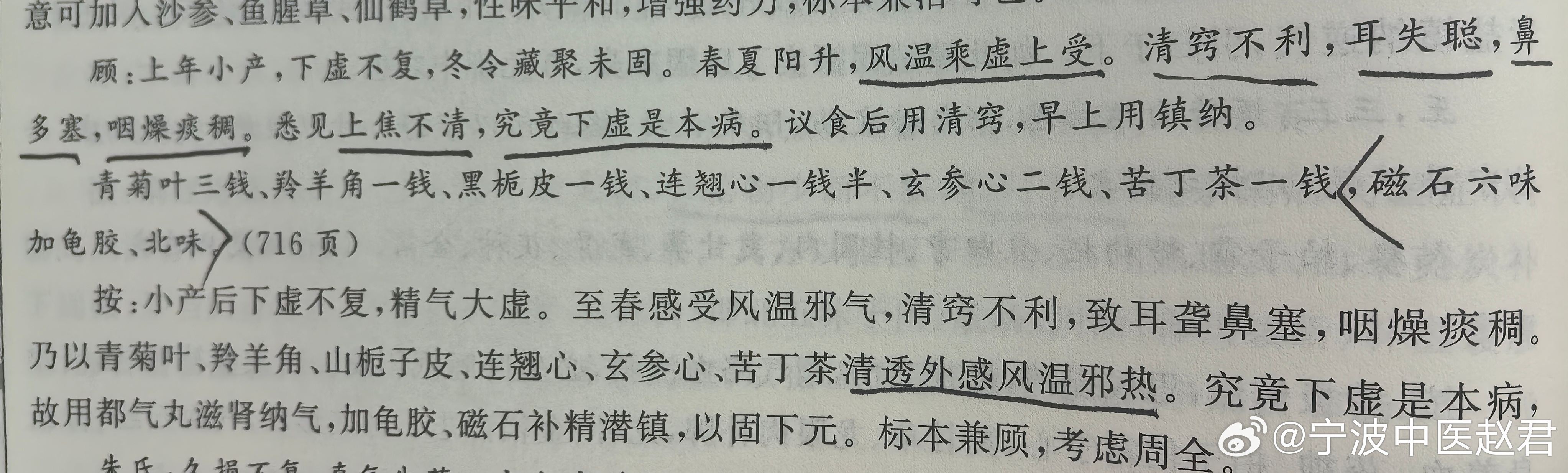 看叶天士这则医案,这位妇人,去年流产,肾虚了,冬天肾精没有封藏好,春天夏天阳气上升,风温之邪乘虚侵袭,耳鸣耳聋,头晕头疼,鼻塞,咽喉干燥,脓痰稠涕……