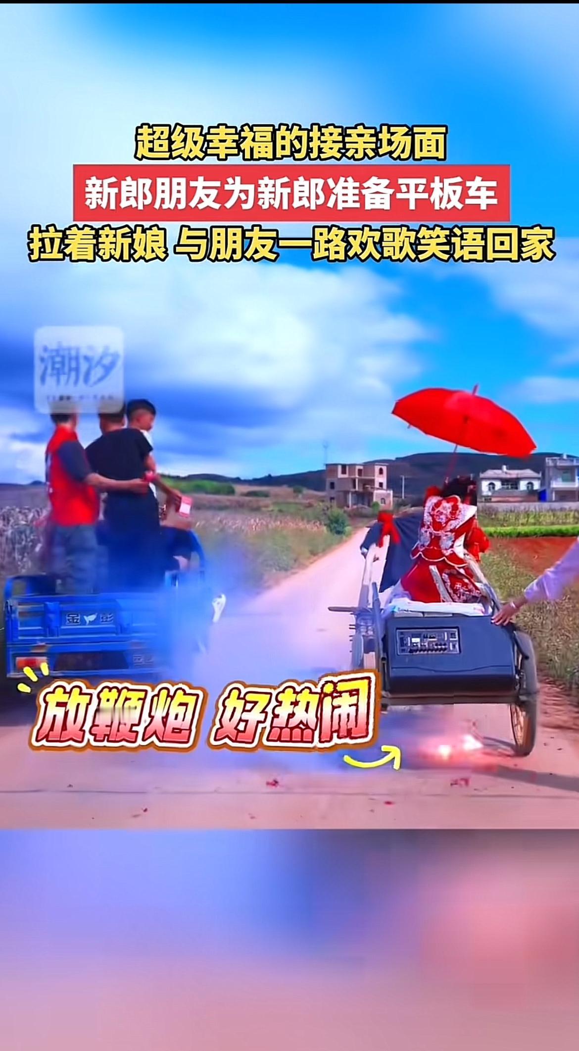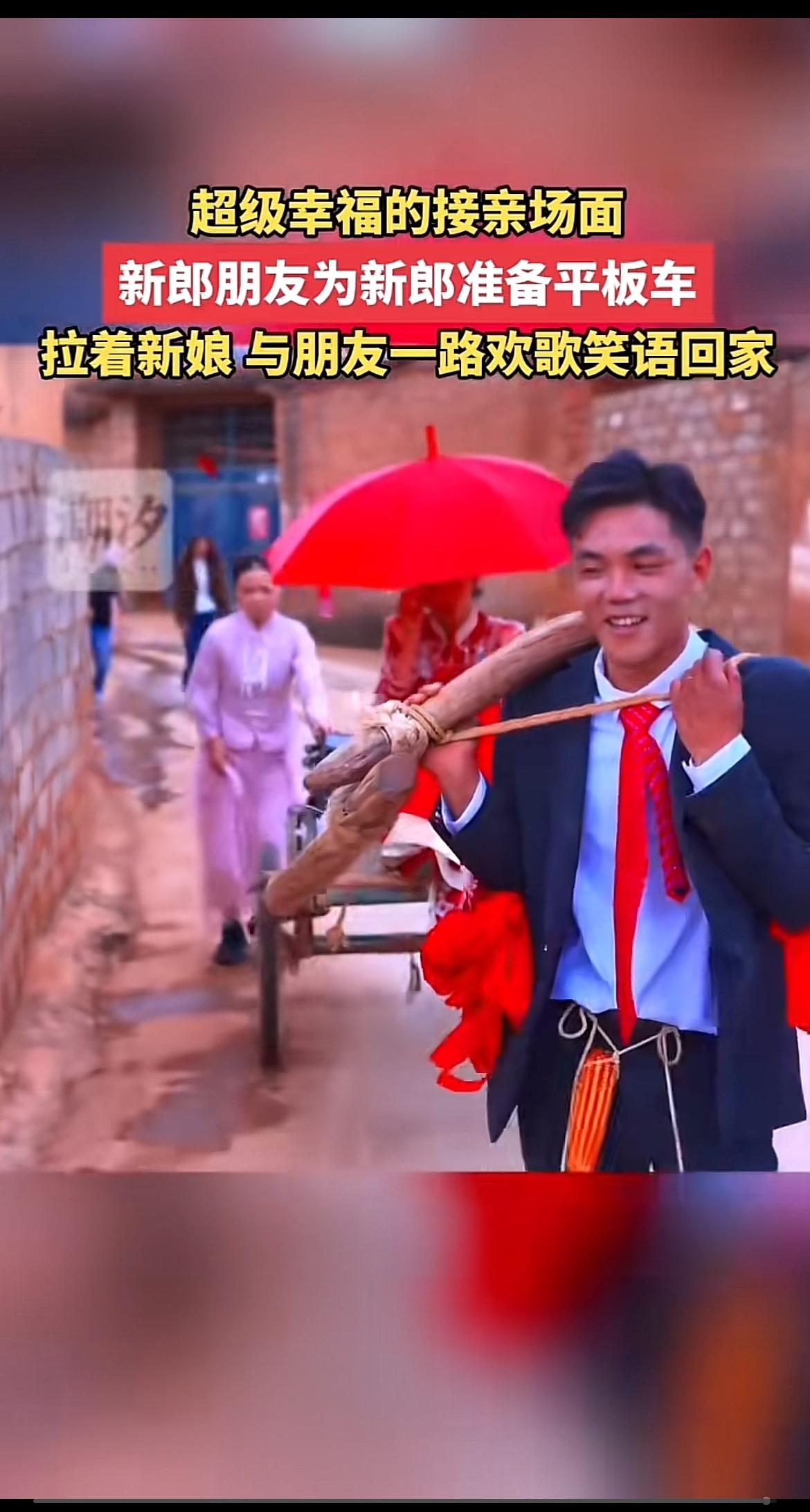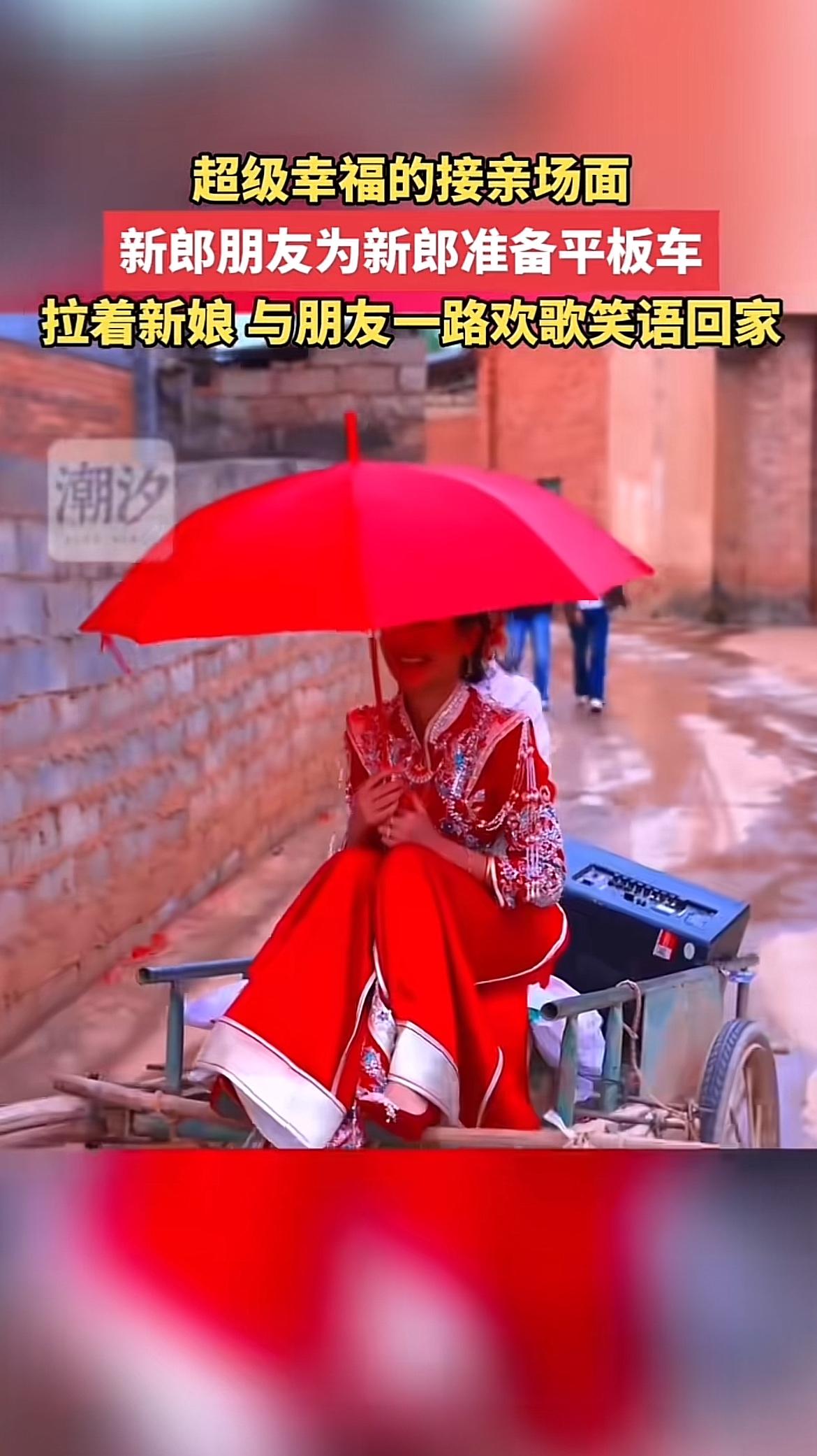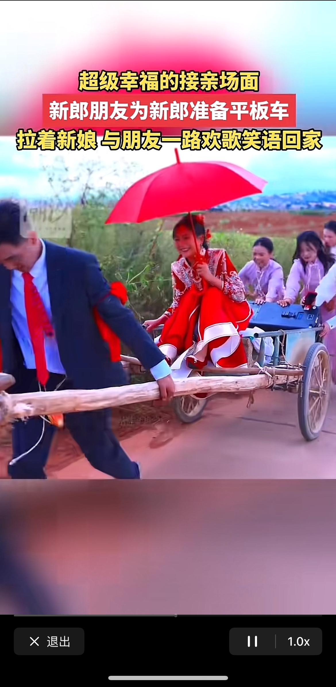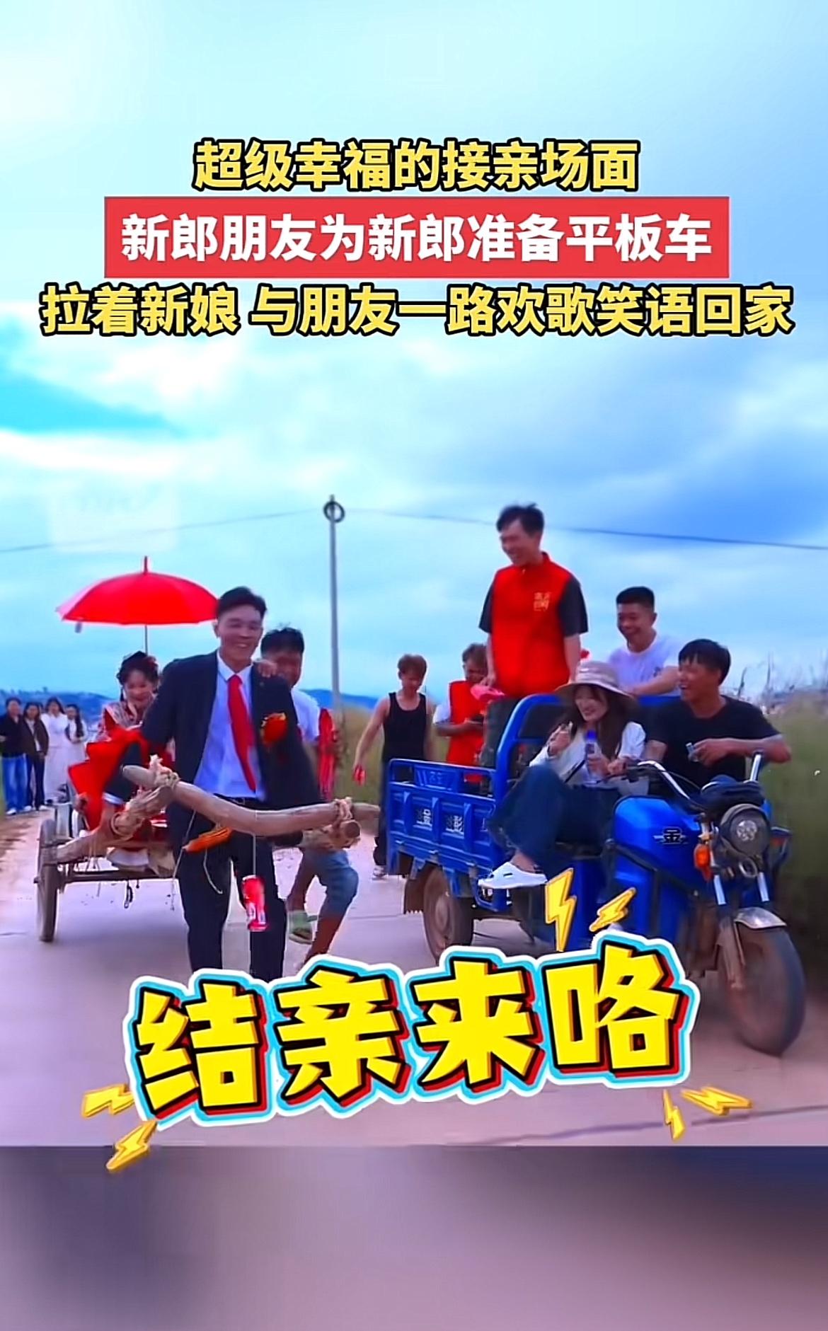 2月13日,怀远县淝河镇的梅友柱用板车把魏庄镇的姜梦琴接出家门,到村口才上婚车。原来,新郎考虑到现在结婚大家都有车,想用特别方式留下终身难忘的回忆,和新娘商量用板车接亲,这主意得到了新娘和双方家长认同。 迎亲那天,6辆装点喜庆的木质板车出现在村口,新郎拉车,新娘坐在车上,满脸幸福甜蜜。周围村民纷纷围观拍照,对他们环保又简约的创意赞不绝口。虽然拉车费力,但这份特别的接亲方式,想必会成为他们一生的美好回忆。