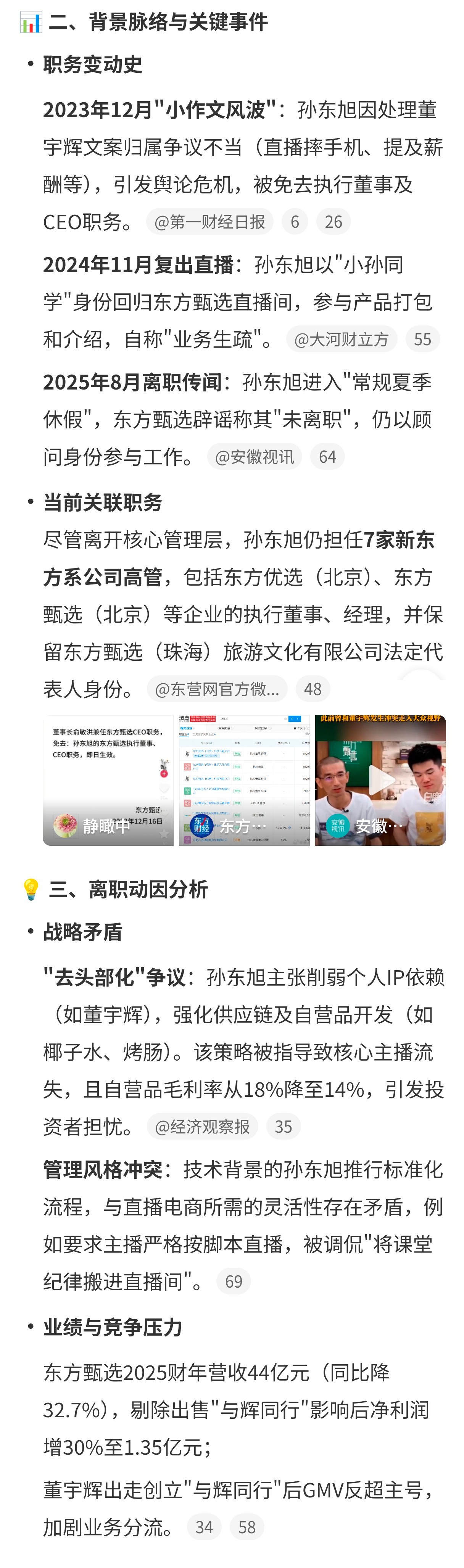 孙东旭从东方甄选离职从小作文风波到今年8月开始休假,旗下的头部主播一个个的离开单干,公司业务也逐步走上正轨~孙东旭在东方甄选这几年过的应该也挺曲折的,离开也未必是坏事~