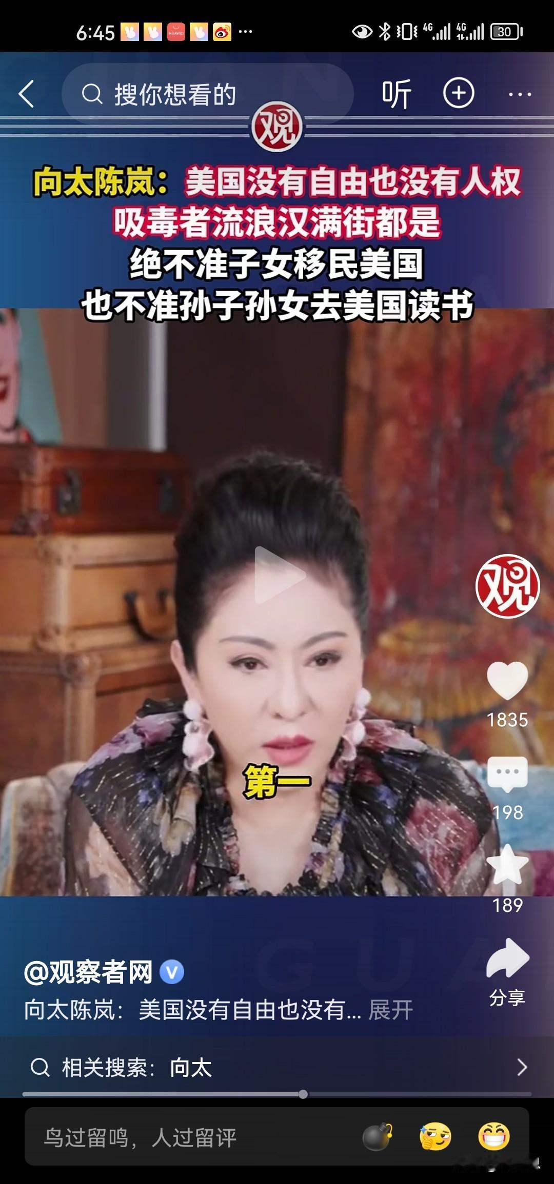 向太陈岚说,不准他的儿子女儿,孙子孙女去美国移民,不准美国🇺🇸读书,如果他们去了,就一分钱不给他们,就把钱全部捐了。先不说向太是不是表决心还是装,她能公开这么说,我佩服是吧?以他们家的条件,想去哪里就去哪里,但他们既然公开说了,我相信他们有这个决心啊,他们已经去过美国的啊,我从不怀疑他们去过美国,就因为他们去过美国,对美国的社会认知才。如此清醒的认知。很多美国公知不乐意了。说向太投了什么投名状,中国古往今来,真正大的人才都是在本国出生,本国选拔的,真正靠外来的人才有几个?没几个。
