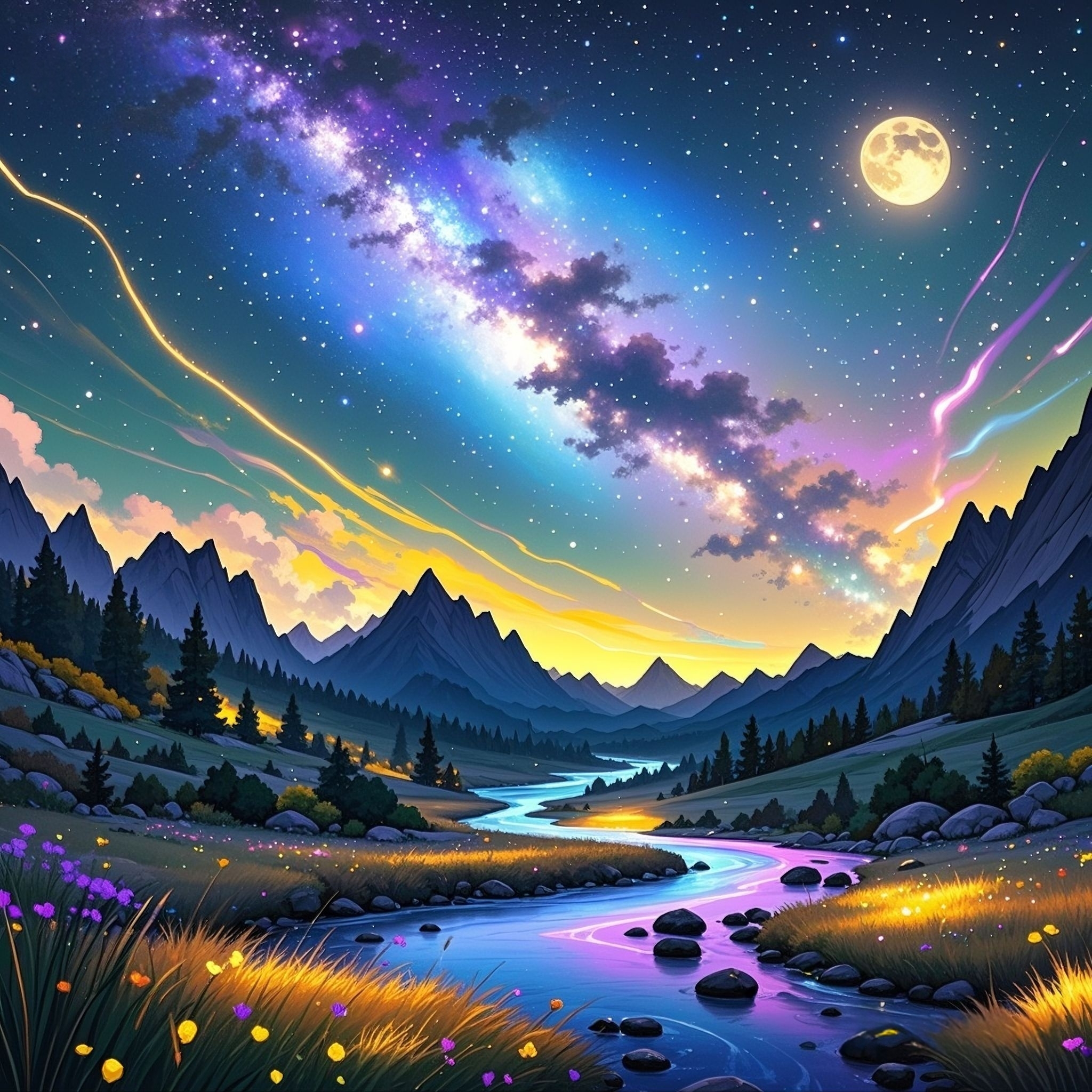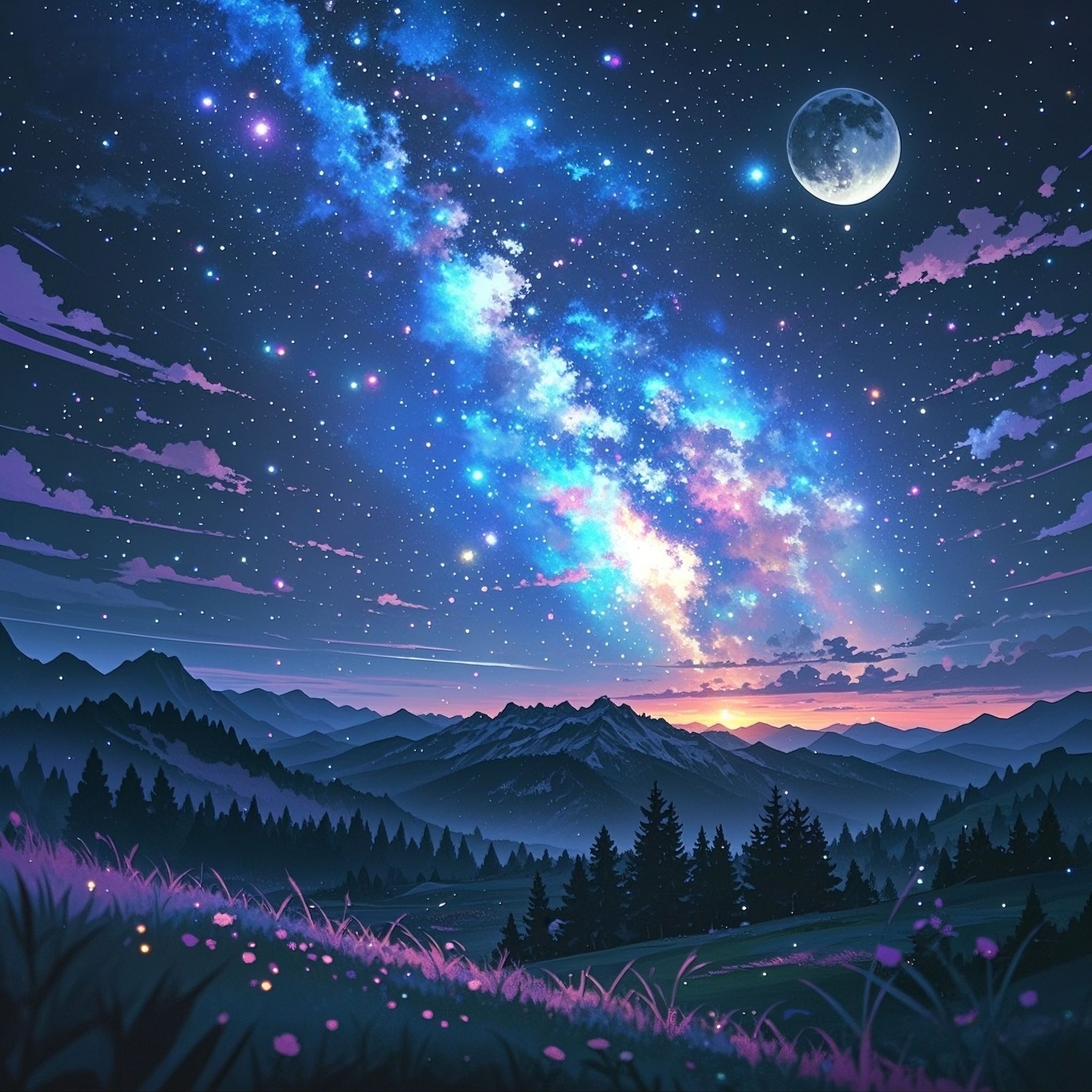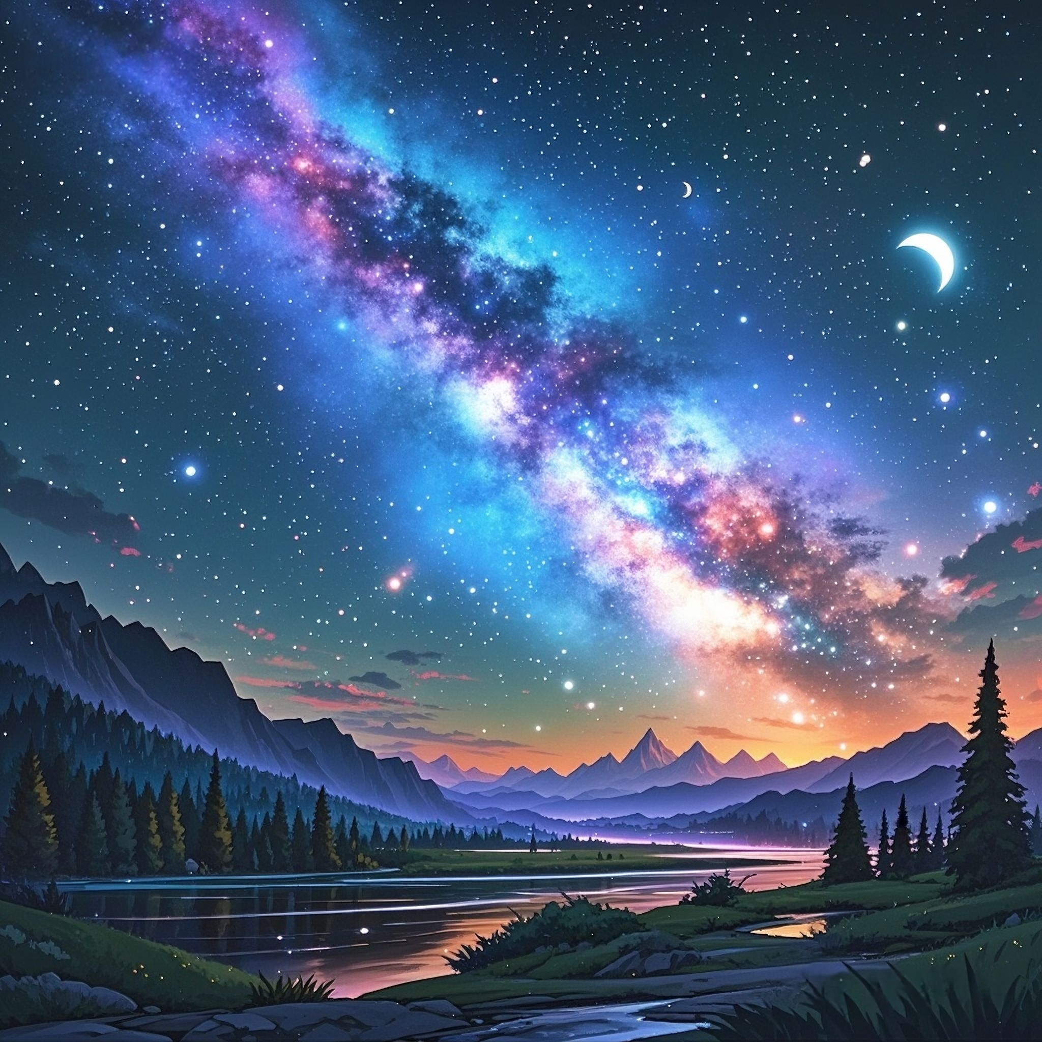 银河倾泻,万点星芒;暗夜无尘,一弯孤月。