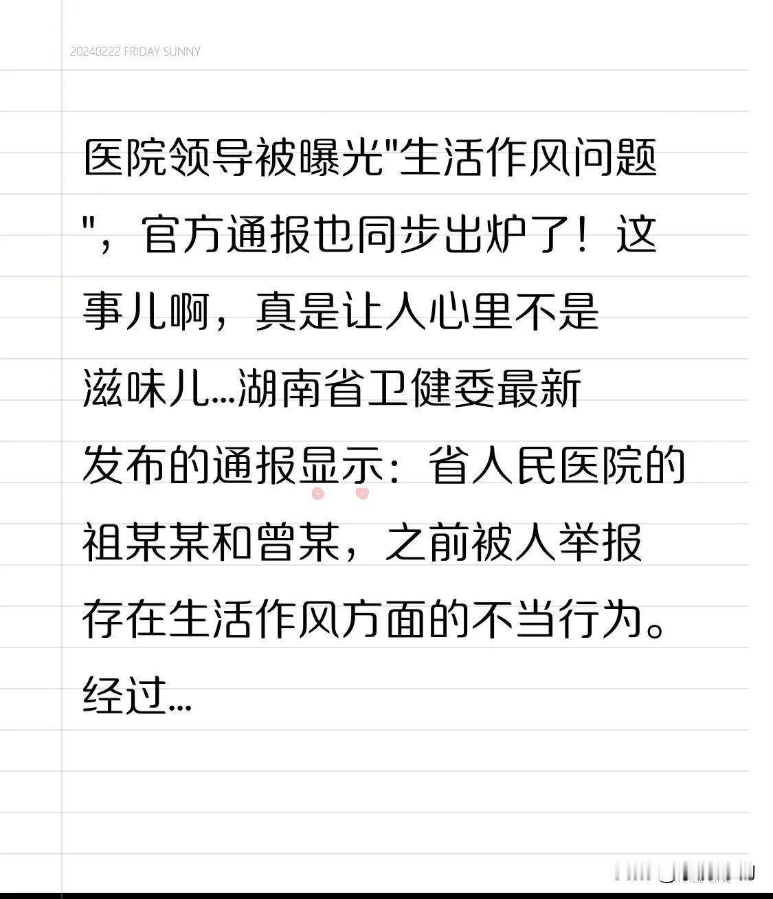 医院领导被曝光"生活作风问题",官方通报也同步出炉了!这事儿啊,真是让人心里不是滋味儿... 湖南省卫健委最新发布的通报显示:省人民医院的祖某某和曾某,之前被人举报存在生活作风方面的不当行为。经过调查核实,情况确实存在,两人已经被暂停了相应的职务,后续会根据调查结果做进一步处理。这消息刚一出来,网友们都炸开了锅:有人开玩笑说"白天穿着白大褂救人,晚上就搞起了些不正经的勾当",更多人则在评论里呼吁"当医生最重要的就是有医德,人品得先过硬才行"。 说起来,医疗行业里这种类似的事情还不是头一回发生。去年就有一家三甲医院发生过类似的情况,最后当事人直接被吊销了从医执照。这次出事的还是省级医院,造成的影响比之前更严重。有内部工作人员透露,他们科室的同事其实早就发现了一些不对劲的地方,但因为抹不开同事间的情面,就一直没去举报。 医生的职业道德建设可不能光靠自己约束自己!建议各地医院赶紧开通匿名举报的渠道,这样才能让医院里的每一个角落都被阳光照到。毕竟啊,当患者把自己的命都交给医生的时候,最担心的就是遇到那种"两面派"的医生。 大家觉得以后该怎么防止这种事儿再发生呢?快来评论区聊聊你的想法吧~ 湖南医院风波 酒店卫生问题 医院检查争议 医院责任追究 湖南医院事件 医院反腐 医疗机构腐败