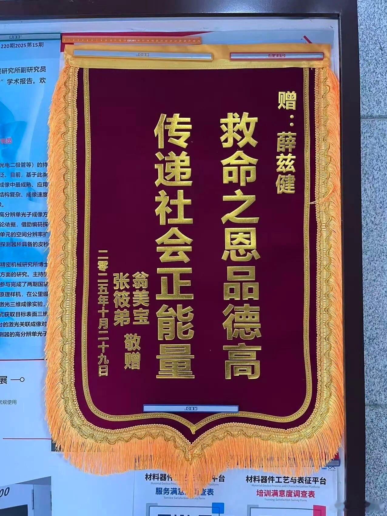 历经四天奔波,几位老人终于将锦旗送到研究所。当薛兹键博士见到这些执着的老人时,感动不已。他谦虚地说:"这只是举手之劳,没想到老人家这么放在心上。"
