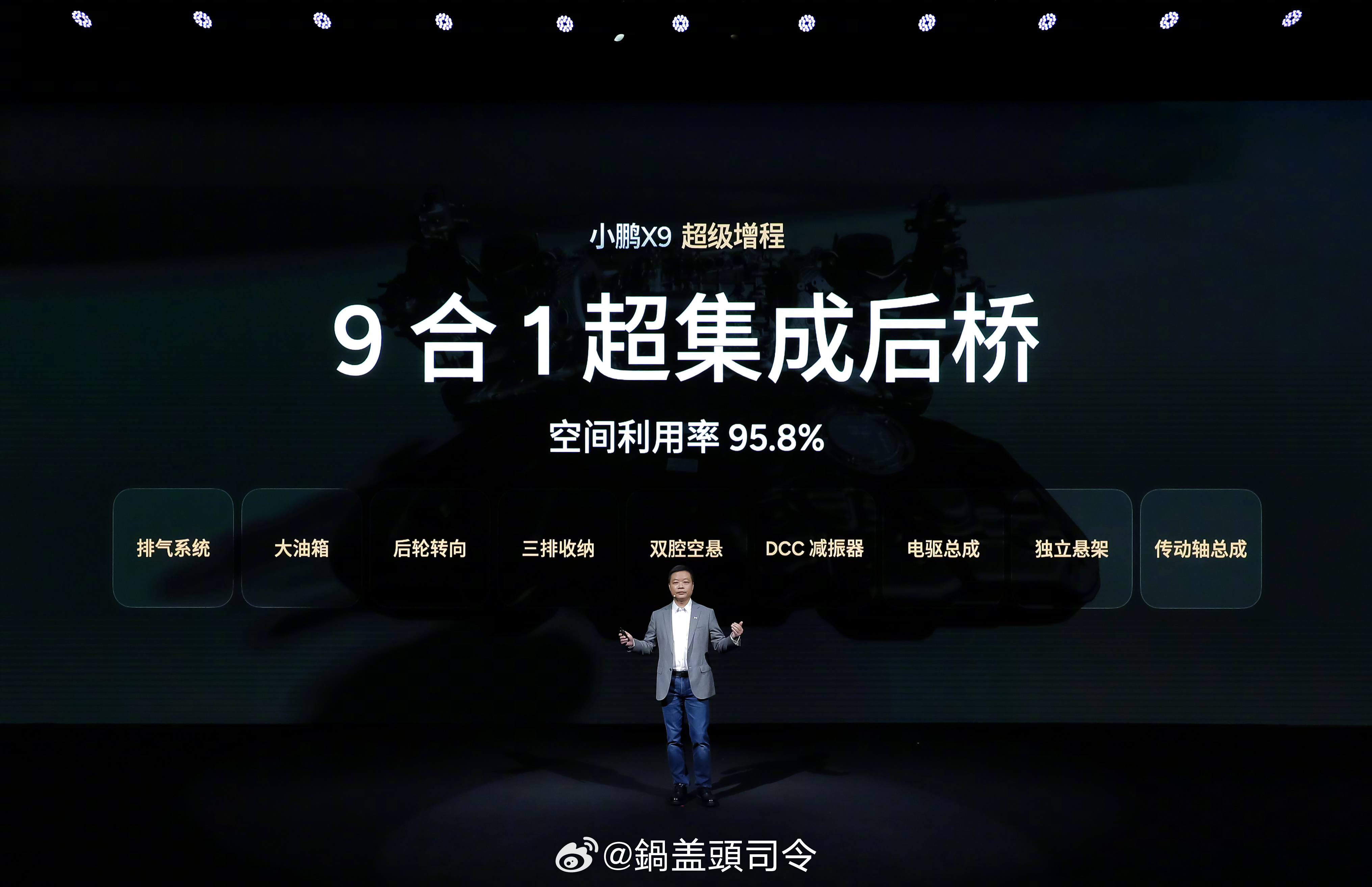 全球唯一9合1超集成后桥,空间利用率高达95.8%,将排气系统、大油箱、后轮转向、三排收纳、双腔空气悬架等9大核心系统融为一体。