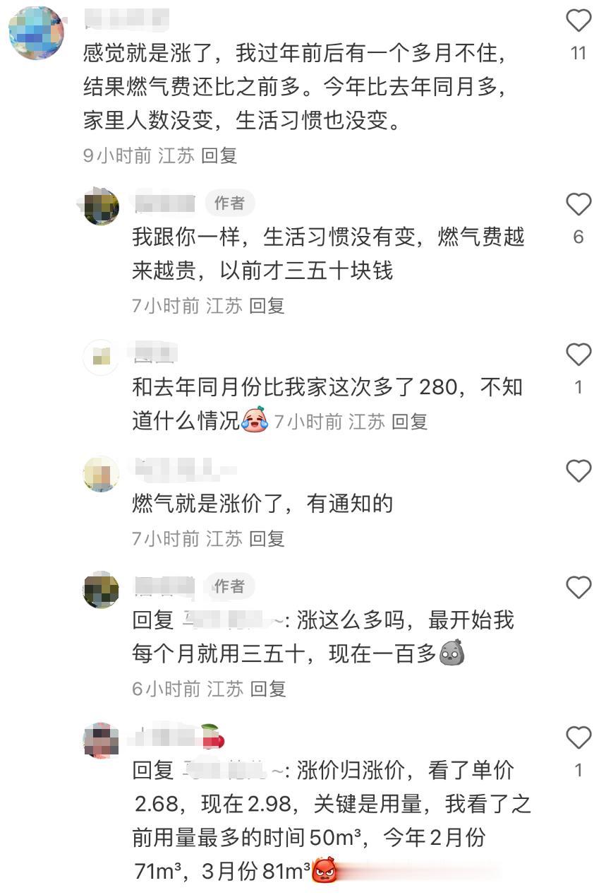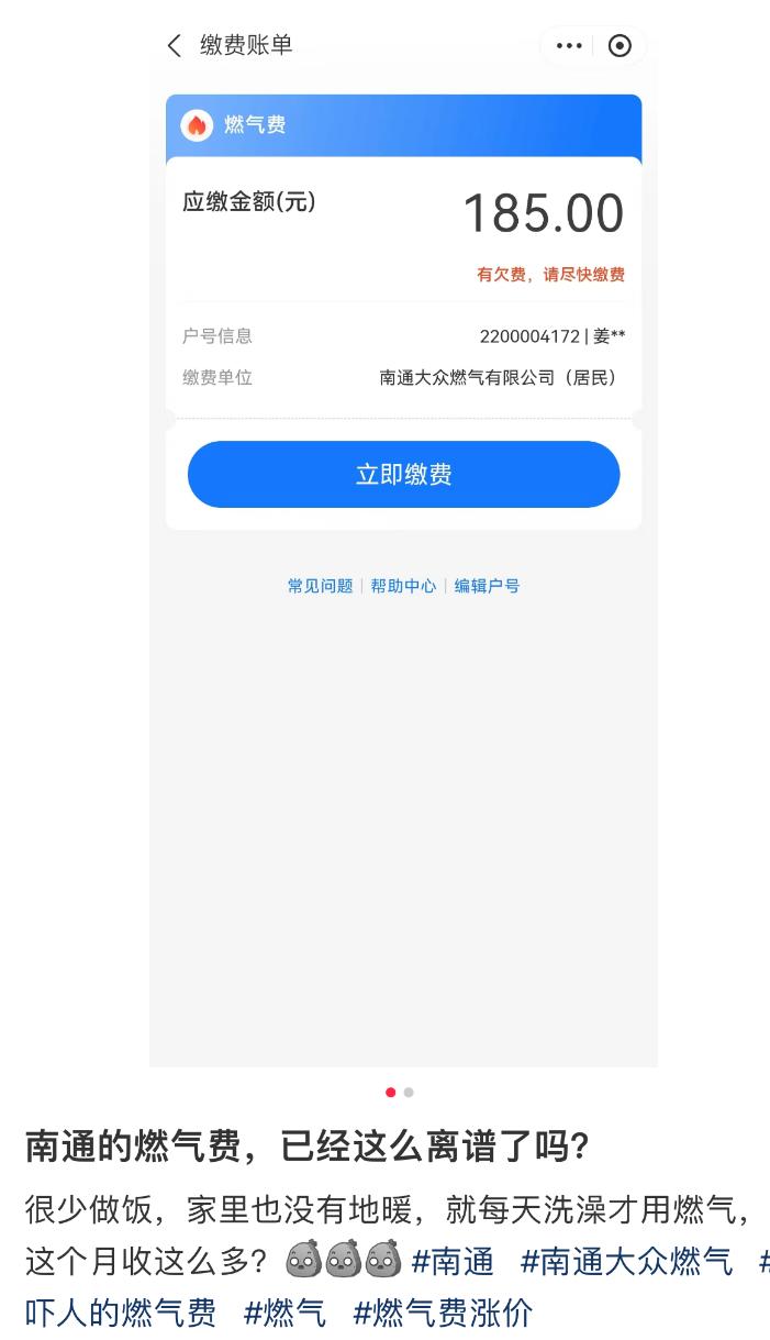 【继重庆之后,南通也被曝出燃气费突然暴涨?】近日,南通不少网友反映家里燃气费突然暴涨,有网友表示“同样是之前的使用习惯,这几个月燃气费却突然贵了好多”,甚至还有网友晒出3月燃气费超3000元。评论区有网友表示“燃气确实涨价了,之前是2.68元/立方米,现在是2.98元/立方米”,还有网友反映“不止燃气费暴涨,电费也是直接翻倍”。此前重庆市区就已经掀起了一股“燃气费用暴涨”风波。针对重庆市民反映的家中燃气计量有误、燃气费用增加等相关问题,4月13日晚间,重庆市政府新闻办举行燃气计量相关情况新闻发布会。发布会称“已责成市级相关部门成立联合调查组,进驻重庆市燃气集团、凯源燃气等企业开展调查工作”。众所周知,水、电、燃气作为居民日常生活中的民生必需品,其价格的上涨将直接导致群众家庭日常生活成本的增加。希望相关部门及时调查清楚,给居民一个合理的解释。