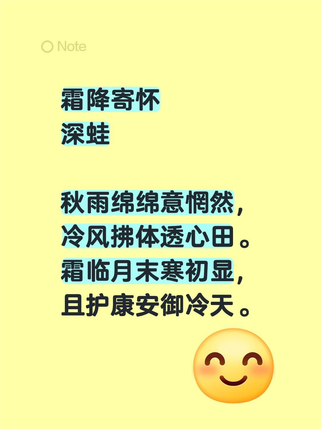霜降寄怀 深蛙 秋雨绵绵意惘然, 冷风拂体透心田。 霜临月末寒初显, 且护康安御冷天。