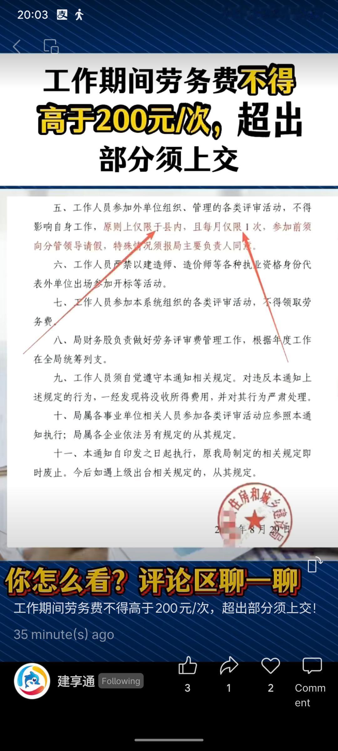 某住建局出台新规,明确工作人员参加外单位评审活动时,工作期间劳务费每次不得超过200元,超出部分须上交。同时规定每月限参加1次且需请假,系统内评审不得领取费用,违规将严肃处理。