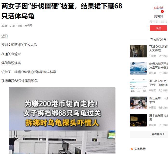 我国海关截查两名女子,掀开裙子一看,好家伙,大腿上密密麻麻缠满了活蹦乱跳的小乌龟,她们竟在裙下藏了68只生物! 这事就发生在深圳湾口岸,那天下午,两个穿着宽松长裙的女子一瘸一拐、步态僵硬地走向通关通道。监控室里的关员一眼就盯上了这反常的步态——裙子明明宽松的很,怎么走路跟被绑住了似的僵硬怪异?拦下来检查时,女关员伸手一摸她们的裙摆内侧,立马摸到了紧身裤上凸凸凹凹的东西。 一掀开裙摆,连见多识广的关员都愣了:黑色紧身裤外面用松紧带横着捆了几十个鼓鼓囊囊的无纺布小包,一挪动就有细细的蠕动感,还有两只小乌龟直接从包缝里探出头来,吓得其中一个女子赶紧往后缩。最后一数,俩人一个藏了39只,一个藏了29只,加起来正好68只活龟。 这种藏法看着隐蔽,其实全是破绽,可走私分子偏偏就爱用这套路。挑女性旅客用长裙做掩护,说白了就是看中长裙能挡住腿上的鼓包,而横着捆的松紧带既能固定住包裹,还能借着人体的温度让小乌龟活着,算是把通关检查的盲区摸得透透的。 这俩女子后来老实交代,她们就是想赚200到300元港币的“带货费”,就答应帮不法分子跑腿,连货要交给谁都不知道,纯粹就是黑色产业链里被利用的小喽啰。 这起案子看着离谱,其实只是跨境活体走私的冰山一角,背后全是“爬宠”市场的暴利在作祟。 经广东省濒危动物研究所鉴定,这批龟是非洲侏儒侧颈龟,在境外原产地卖得很便宜,可一到国内“爬宠圈”,被冠上“秘境精灵”的名头后,每只就能卖到几百块,身价直接翻倍。 这种利润差在其他物种走私里更吓人,温州海关之前查获过一起巨蜥走私案,境外几百块一只的泽巨蜥,到了国内能卖到几千元。山东有个叫曲某的男子,就因为走私、售卖这类濒危物种,最后被判了九年六个月。 这些走私分子摸准了市场需求,知道侏儒侧颈龟体型小、好养活,成了热门宠物,就铤而走险用人来运输——既躲开了邮件查验的风险,还能保证小乌龟活着到目的地。 更让人担心的是,这些没经过检疫的外来物种一旦流入国内,会给生态环境带来大麻烦。 侏儒侧颈龟长着锯齿状的锋利牙齿,能轻松咬碎螺壳,鱼卵、水草、无脊椎动物全吃,生存能力特别强,就算遇到干旱也能休眠好几个月。要是不小心逃到自然水域里,很快就会变成生态系统的“破坏王”。 这可不是瞎操心,吉林松花江就出过千只巴西龟被放生的事,这种外来龟4-5年就能成年,一年能产卵3-5次,短短几年就把本土龟的生存空间挤得严严实实。 大连有个池塘,一只巴西龟在6年里几乎把池塘里的青蛙全吃光了。 更可怕的是基因污染,外来龟多了,本土龟被迫和它们杂交,原生种群的基因就会退化,这种破坏一旦发生就没法挽回。 除了生态风险,公共卫生安全也悬得很。检测发现,这批侏儒侧颈龟身上带了未知的寄生虫卵和沙门氏菌,这种细菌能通过接触传染给人,对老人和小孩的威胁尤其大。 温州那起巨蜥走私案里,买家孙某收到的苏门答腊巨蜥,养了两三天就死了,就是因为运输时环境差还没经过检疫。这种病死的外来物种要是随便扔了,很可能让病菌扩散开来。 这次查获的68只龟里,已经有几只因为被捆绑挤压,出现了体温过低、龟壳磨损的问题,要是没被海关拦下,不管是活着还是死了,都藏着公共卫生隐患。 海关能拦下这俩女子,可不是靠运气,而是科技手段和人工排查一起发力的结果。 深圳海关早就建了非贸一体化管控平台,用大数据拼出“全景画像”,能精准锁定高风险的人和物品,还装了“异宠”活体智能检测仪,就算是包裹里的小动物轻轻爬动,仪器也能捕捉到震动并报警。 就在这起藏龟案发生前几个月,深圳邮局海关还靠这技术,在快件里查出15只藏在手工纪念品里的活体蜥蜴,在邮件里截获了3882只猎镰猛蚁。 可走私分子的手段也在升级,以前是用方便面包装藏巨蜥,现在改成人体绑藏,总想着钻空子,这让国门生物安全防护一直不能松劲。 目前这68只侏儒侧颈龟已经被转移到恒温隔离箱里,要接受30天的检疫观察,案子也移交给相关部门立案处理了。 但类似的走私案还在不断发生,光深圳海关每年就会截获402种次外来物种,其中爬行动物的占比还在慢慢上升。 那些为了几百块“带货费”就铤而走险的人可能不知道,他们扛下的不只是法律责任,还有整个生态系统的安危。