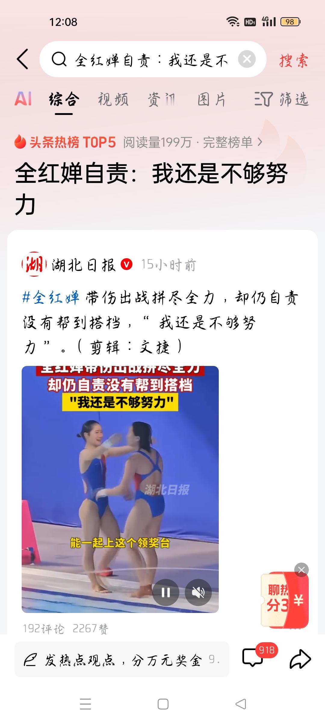 我还是不够努力,我想说 据湖北日报报道,全红婵带伤出战拼尽全力,却仍自责没有帮到搭档,“我还是不够努力",我想说,全红婵带伤训练,带伤比赛,她已经尽力了,却还在自责,个人认为,她情商很高,也有人说搭档存在问题,她没有指责对方,而是自责,这就是博大的胸怀,也有人说,她排名不是第一,个人认为,比赛应该友谊第一,成绩第二,赛出好的风格。各位条友觉得呢?