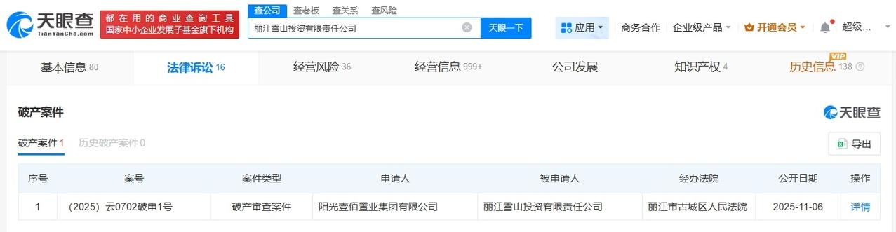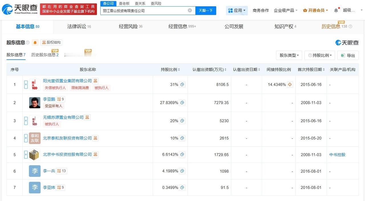 李亚鹏公司被申请破产 李亚鹏公司被股东申请破产 天眼查天眼风险信息显示,11月6日,丽江雪山投资有限责任公司新增1则破产审查案件,申请人为阳光壹佰置业集团有限公司,经办法院为丽江市古城区人民法院。 丽江雪山投资有限责任公司成立于2008年11月,法定代表人为李国栋,注册资本约2.6亿人民币,经营范围包括房地产开发、文化产业投资等。股东信息显示,该公司由阳光壹佰置业集团有限公司、李亚鹏等共同持股。其中,李亚鹏持股约27.8%,阳光壹佰置业集团有限公司持股31%。 天眼查信息: