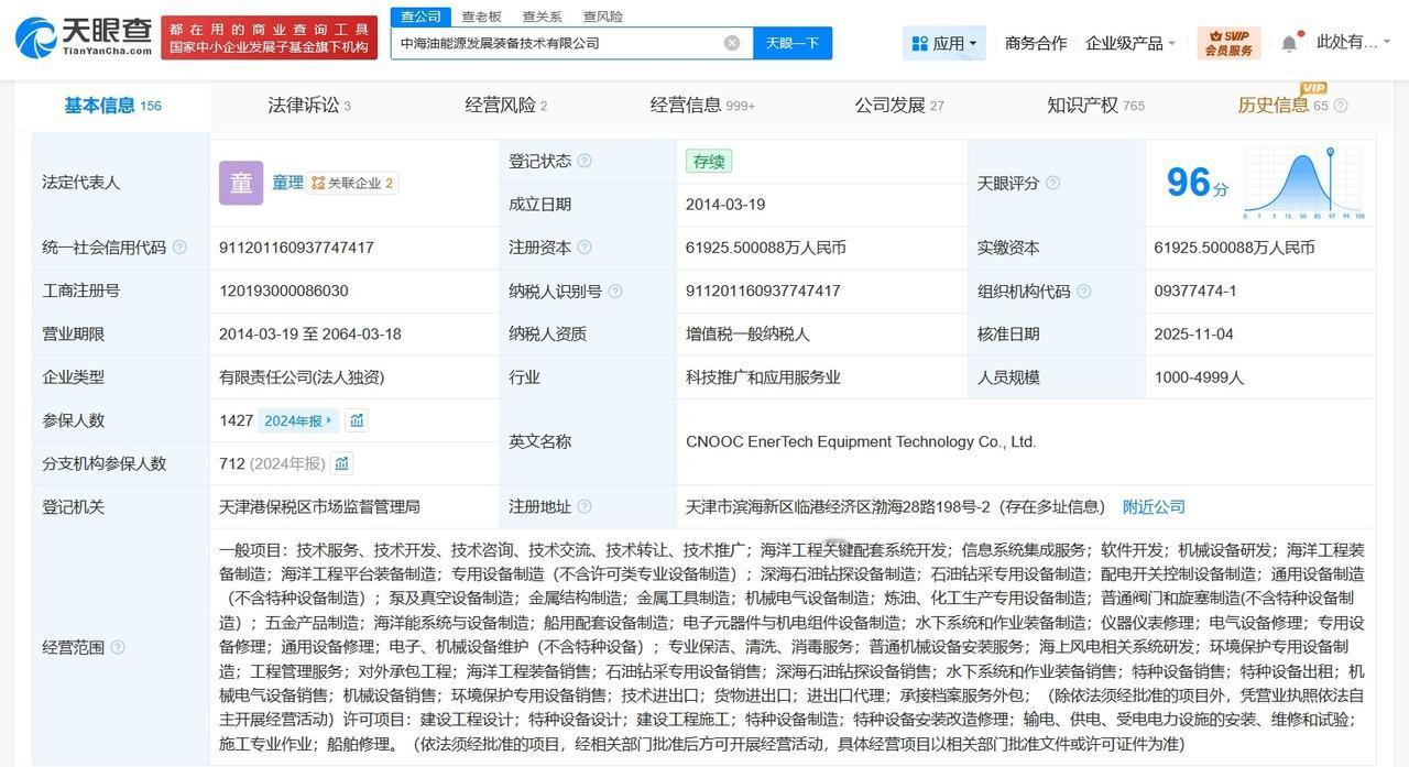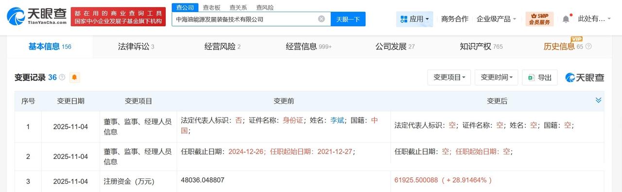 中海油能源发展装备技术公司增资至6.2亿增幅约29% 天眼查工商信息显示,近日,中海油能源发展装备技术有限公司发生工商变更,注册资本由约4.8亿人民币增至约6.2亿人民币,增幅约29%,同时,部分高管发生变更。 该公司成立于2014年3月,法定代表人为童理,经营范围含海洋工程关键配套系统开发、信息系统集成服务、海洋工程装备制造、海洋工程平台装备制造、专用设备制造、深海石油钻探设备制造、石油钻采专用设备制造等。股东信息显示,该公司由海油发展全资持股。 天眼查信息: