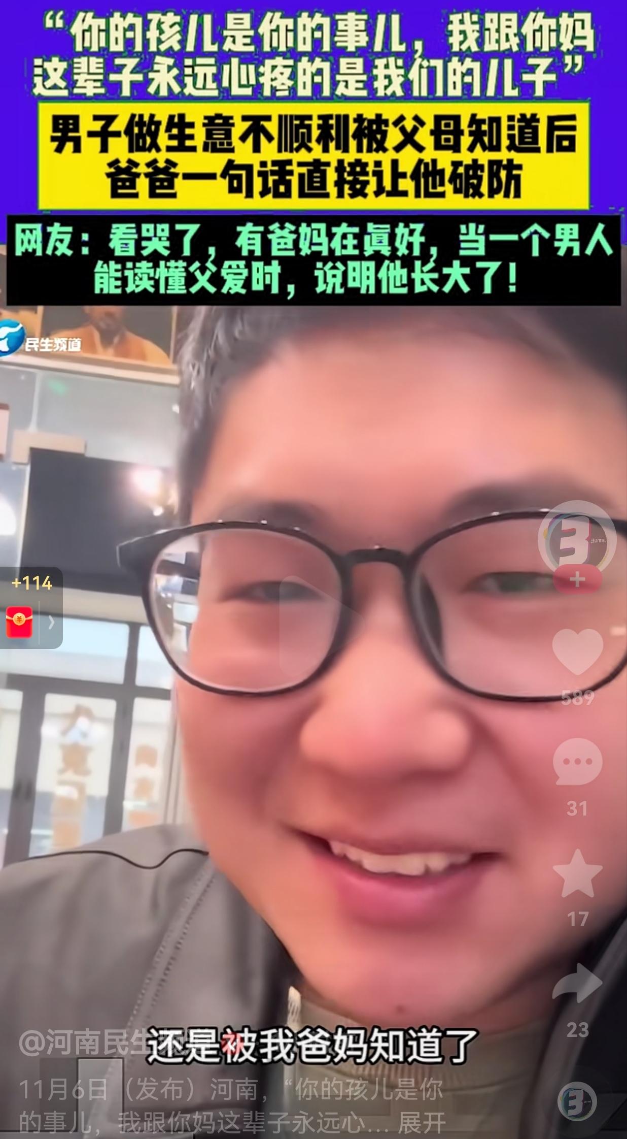 泪目了!爸爸的一句“你的孩儿是你的事儿,我跟你妈这辈子永远心疼的是我们的儿子。”我想谁听了这句话不会感动满满呢? 近日,河南一爸爸知道儿子的生意不景气,就给儿子打了一通电话,电话那头爸爸询问儿子,你缺不缺钱?爸爸可以给你援助一点。 电话这头,男子知道爸爸很担心自己,为了不让爸爸为自己操心。男子就这样回复了爸爸,男子说:“没事,生意已经慢慢好起来了,虽然回本有点慢,但是也可以干的下去,只要用点心就可以了。” 接着,男子话锋一转,就转到了自己的孩子身上。男子认为,自从他有了儿子以后全家人的重心都在围绕着孩子在转了。 然而,爸爸的一番话,让男子不禁泪流满面。这位父亲是这样说的,爸爸说:“你的孩子是你的事情,我跟你妈这辈子永远心疼的是我们的儿子。” 听到这句话,男子一向坚强的心变得柔软了,脸也变得通红,感动地无以复加,差点就要哭了起来。 网友看到后评论说,看哭了,有爸妈在身边真的好。当一个男人能读懂父爱时,说明他真的长大了! 还有的网友说,这个世界上最爱你的永远都是你的父母,他们永远都盼着你过好,再大在他们眼里都是孩子啊! 我们都说隔辈亲,爷爷奶奶对孙子那是真的喜欢,一点杂质都不带掺和的。 那是因为父母把儿子的爱投射到孙子的身上了,看到小孙子就想起了自己的儿子。而儿子长大了,不在自己的身边,也不能陪伴自己。于是,爷爷奶奶把自己所有的爱都给了自己的小孙子。 因为,小孙子是儿子最爱的人,他们也想把儿子最爱的人照顾好。 大家觉得呢?欢迎大家评论区讨论留言。