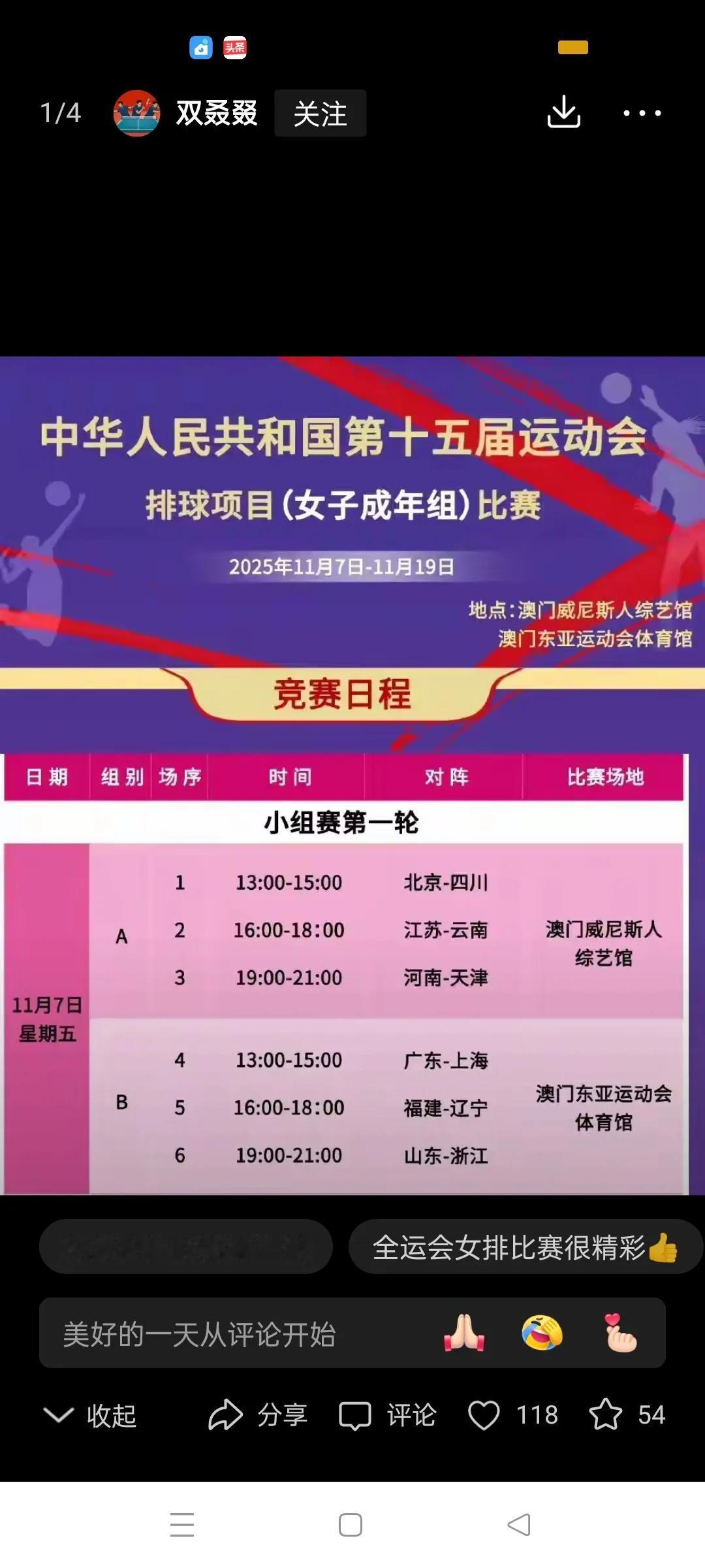 北京时间11月7日,第十五届全运会排球项目女子成年组首轮将在今天下午13点拉开帷