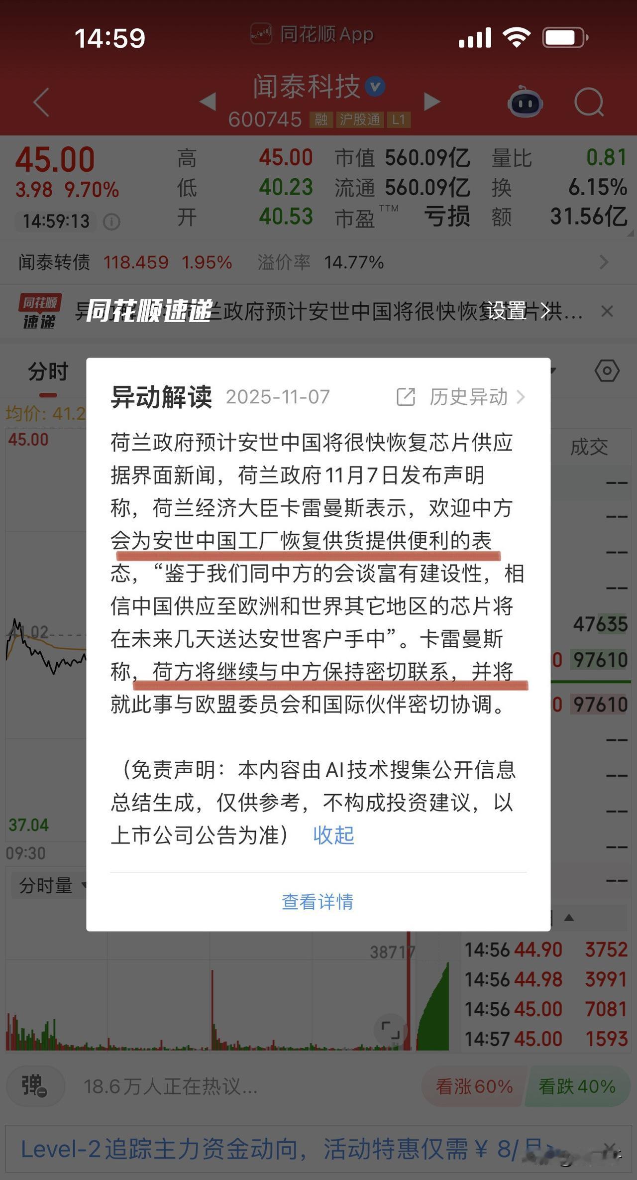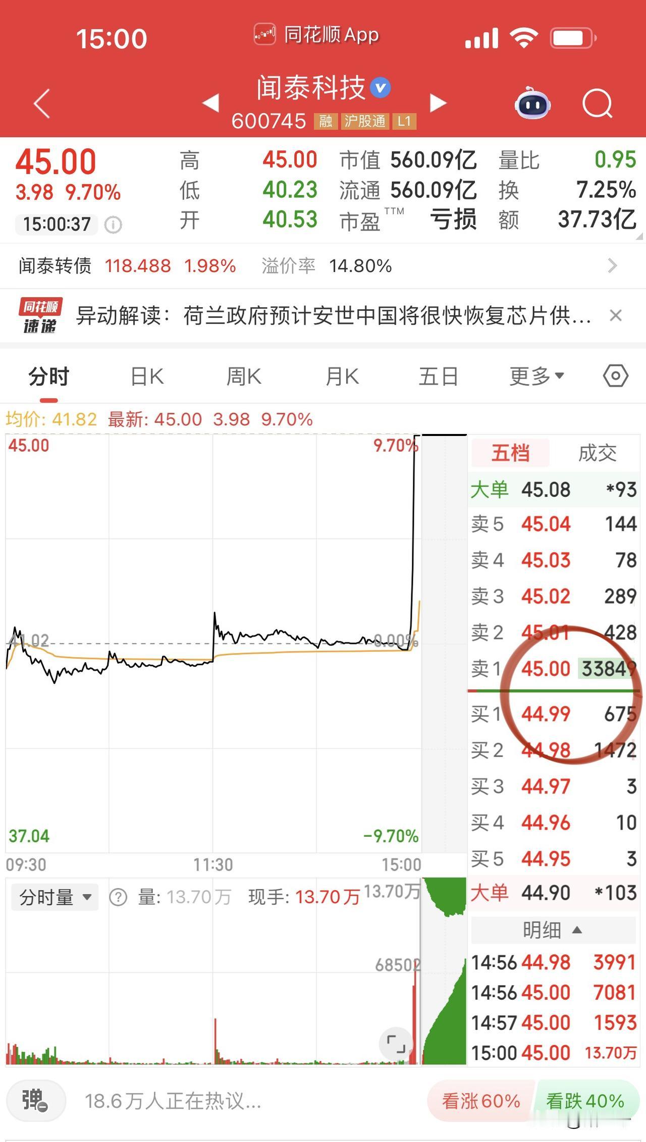 闻泰科技尾盘3min见证奇迹, 荷兰政府安世半导体问题借坡下驴, 主动向中方求和并表达希望恢复供货的意思。 闻泰科技秒拉升, 离涨停就那么一丁点距离。 合富中国地天板, 市场众多方向蠢蠢欲动压不住了, 4000点是股民心理的桎梏, 并不是本轮牛市的桎梏。 无人问津的方向开始有主力试盘, 奥美医疗、山外山、司太立等老登股, 开始底部走出放量大阳线。 格局打开、暗香自来…
