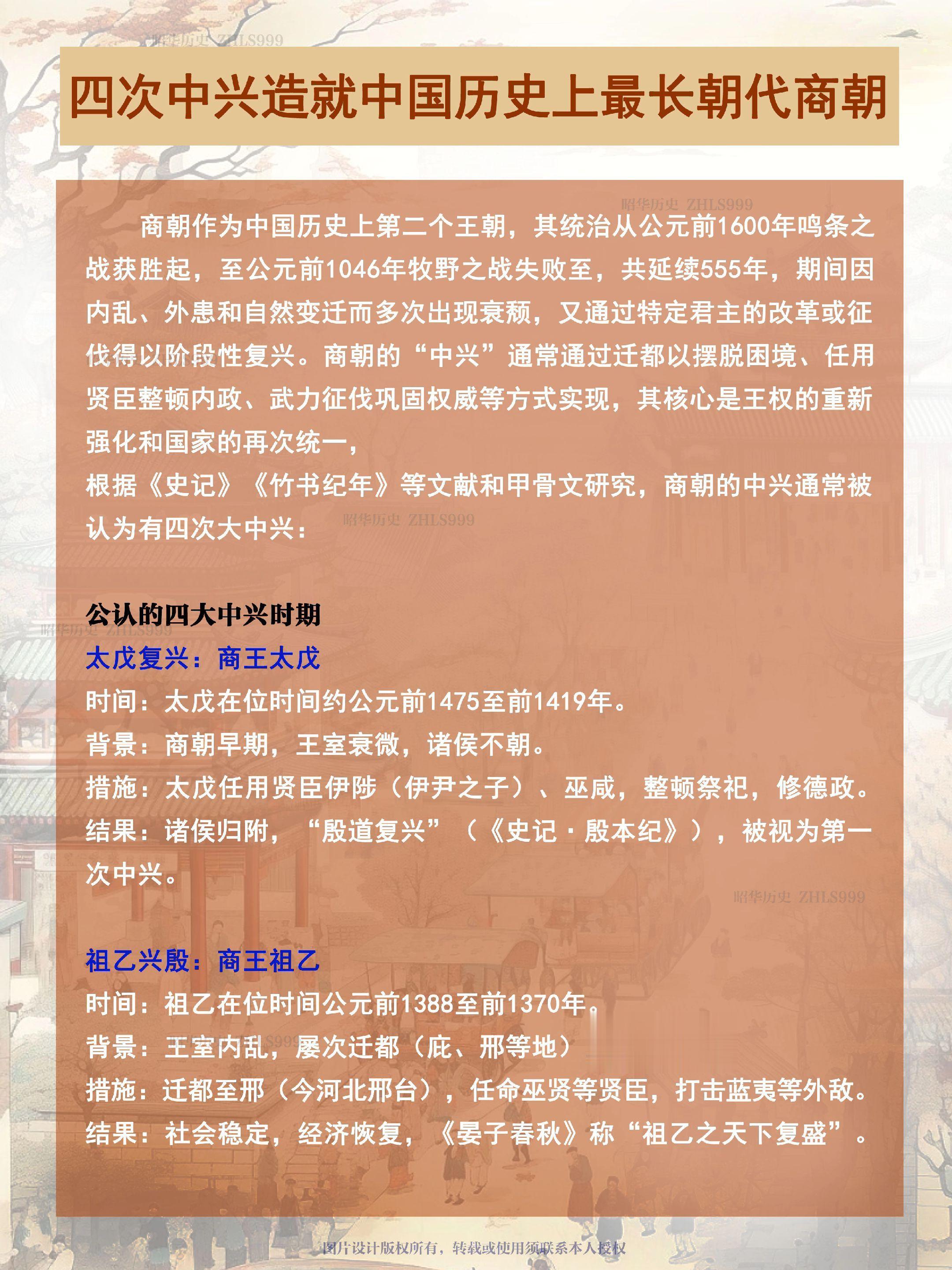 最长朝代商朝的四次中兴。商朝作为中国历史上第二个王朝,其统治从公元前1600年鸣条之战获胜起,至公元前1046年牧野之战失败至,共延续555年,期间因内乱、外患和自然变迁而多次出现衰颓,又通过特定君主的改革或征伐得以阶段性复兴。商朝的“中兴”通常通过迁都以摆脱困境、任用贤臣整顿内政、武力征伐巩固权威等方式实现,其核心是王权的重新强化和国家的再次统一, 根据《史记》《竹书纪年》等文献和甲骨文研究,商朝的中兴通常被认为有四次大中兴: ❗️公认的四大中兴时期 🔴太戊复兴:商王太戊 时间:太戊在位时间约公元前14