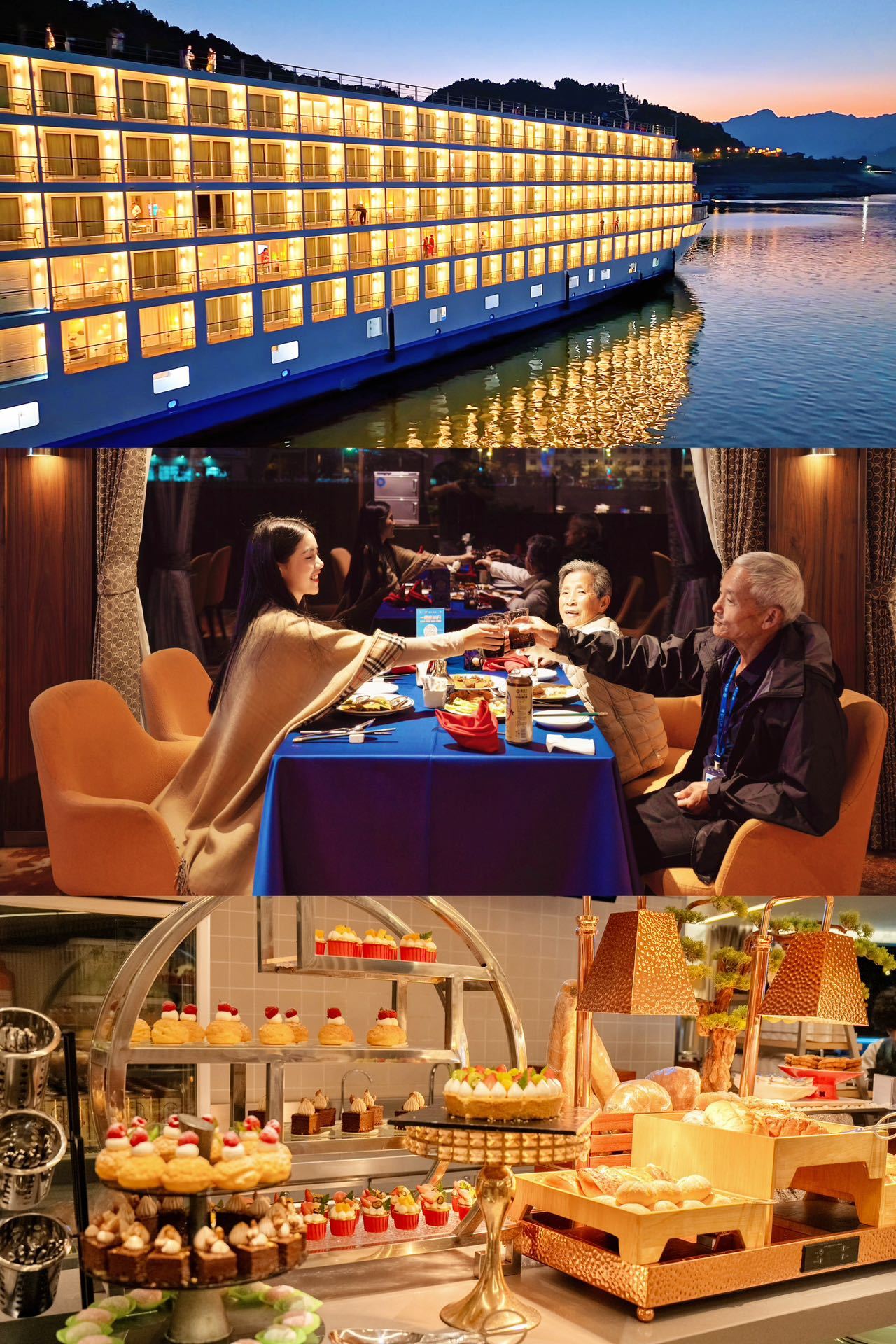 长辈出行最在意的就是省心,这趟行程完全不用操心:不用自己搬行李,客房宽敞又整洁,住得像家里一样舒服;静音电推船行驶超稳,晕船星人也能放心冲;一天 3 顿中西式自助餐不重样,长辈的口味全满足;晚上要么看场轻松的文娱演出,要么在阳台吹着江风看夜景,自在又松弛~