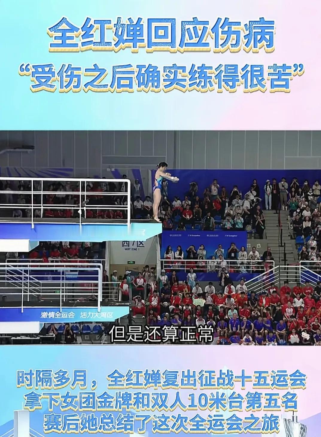 第五名,同样是各路采访围着,观众注视着,没有办法,这就是人气,也说明全红婵受人们喜欢程度。 带伤作战,参加两项,全体金牌,双人第五,全红婵结束本届全运会之旅。好好养伤休息,好好调整训练,期待接下来精彩。