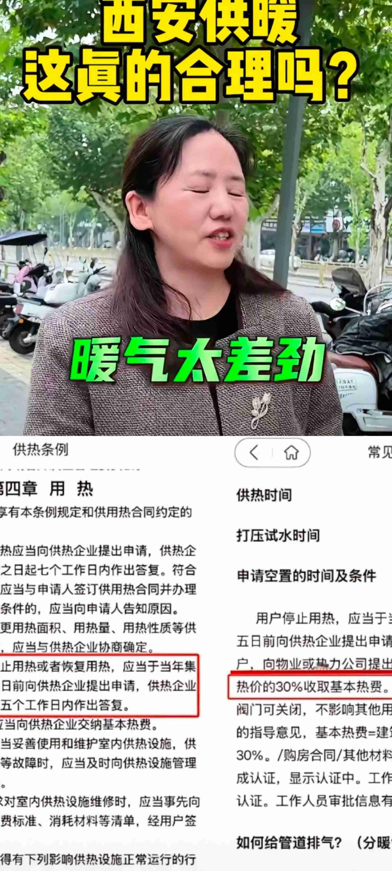 西安供暖出事了。 以前供暖就是平平常常,没想到今年西安的供暖直接上热搜,而且还是不间断的,直接让全国人民看到西安供暖到底是什么样子的。 西安供暖这波操作,真是把“收钱积极办事敷衍”玩明白了!全国第四的暖气费标准,享受到的却是“靠太阳取暖”的待遇,难怪能一直霸占热搜。 5.8元/平的费用不低,可室温上不去、水压跟不上是常态,管路漏水维权还被“踢皮球”。更离谱的是测温套路,大中午关窗测完说达标,当业主没见过太阳吗?八个月的非供暖期,按理说该好好检修维护,结果全用来琢磨怎么收费了——不用暖气要交30%空置费,美其名曰补偿能耗,实则更像“躺赚”的霸王条款。 服务热线打不通,问题投诉没人管,所谓的集中供暖,反倒成了民生痛点。与其纠结空置费合不合理,不如先把“供好暖”的本职做好,推行直供到户取消中间环节,才是解决问题的关键。 你家暖气达标了吗?觉得30%空置费该收吗?来评论区吐槽你的供暖糟心事~带定位晒今日生活西安暖气 供暖乱象 供暖收费乱象 供暖差异