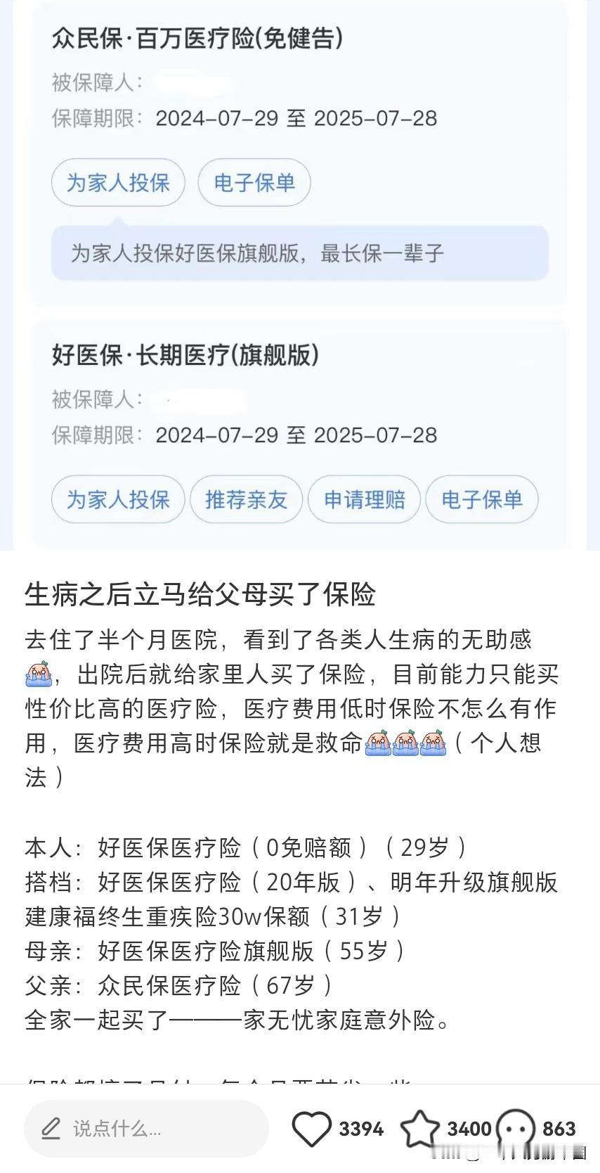 突然发现,关于未来如何给爸妈养老,新一代年轻人释放了一个重要信号! 最近,关于“农村出现退保潮”的谣言你刷到过吗?为啥我笃定它是谣言呢?因为我们老家临近几个村绝大多数人依旧是年年参保,而且从数据上看,全国基本医保的参保率也一直稳定在95%以上,并不存在所谓退保。 那这种说法怎么来的?其实就是有人看到参保人数比以前少了就以为是退保,但这主要是因为国家统一信息平台上线后,清理了重复参保数据以及大学生就业后转为职工医保的原因。 而且只要你多注意下,会发现如今年轻人不仅不“退保”,反而更积极、更有规划地为自己父母“加保”。 比如最近登上热搜的“拿买房首付款15万为父母补缴社保”的陈茵,自从她发现老家可以补缴社保后,果断拿出几年积蓄,为父母补缴了社保。她说:“爸妈辛苦一辈子,不能让他们老了还没底。 其实当下如陈茵这么做的年轻人并非个例,像杭州的小袁就是其中之一,这位宝马在某书发帖表示:不仅几年前就在互联网保险优选平台蚂蚁保上为父母配置了医疗险,最近还为母亲补缴了养老保险。“双保险”配齐,她才真正安心。 可以看到,真相与“退保潮”的悲观论调相反。这届年轻人展现出超前保障意识感。通过给父母补缴社保,保证了父母生活开支,而医疗险,才真的补齐了保障最后一款短板。 像某书另一位宝妈球球的经历,就能说明,一旦遇到大问题,光养老金还是不够的。 她发帖说前段时间母亲患癌,她去陪护又查出怀孕了,哪边都需要钱,一度想过不要孩子。幸好之前在互联网保险优选平台蚂蚁保上买的重疾险理赔了4万元,大大缓解了家庭压力,不仅留下孩子,母亲病情也有好转。她感叹:只后悔当初保障买少了! 所以说,有了“养老保险和蚂蚁保医疗险“的双保障配置,既满足父母生活所需,也不担心生病住院花钱。像杭州小袁这样年轻人的做法无疑释放了一个信号! 只有提前为家人撑起一把伞,未来才不至于手忙脚乱。