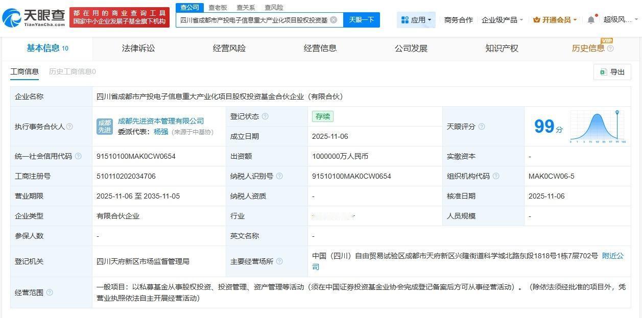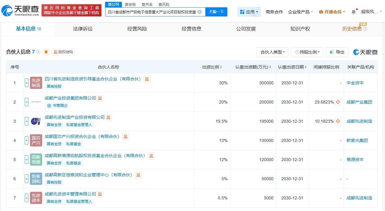四川成都产投电子信息重大产业化项目股权投资基金成立出资额100亿 天眼查App显