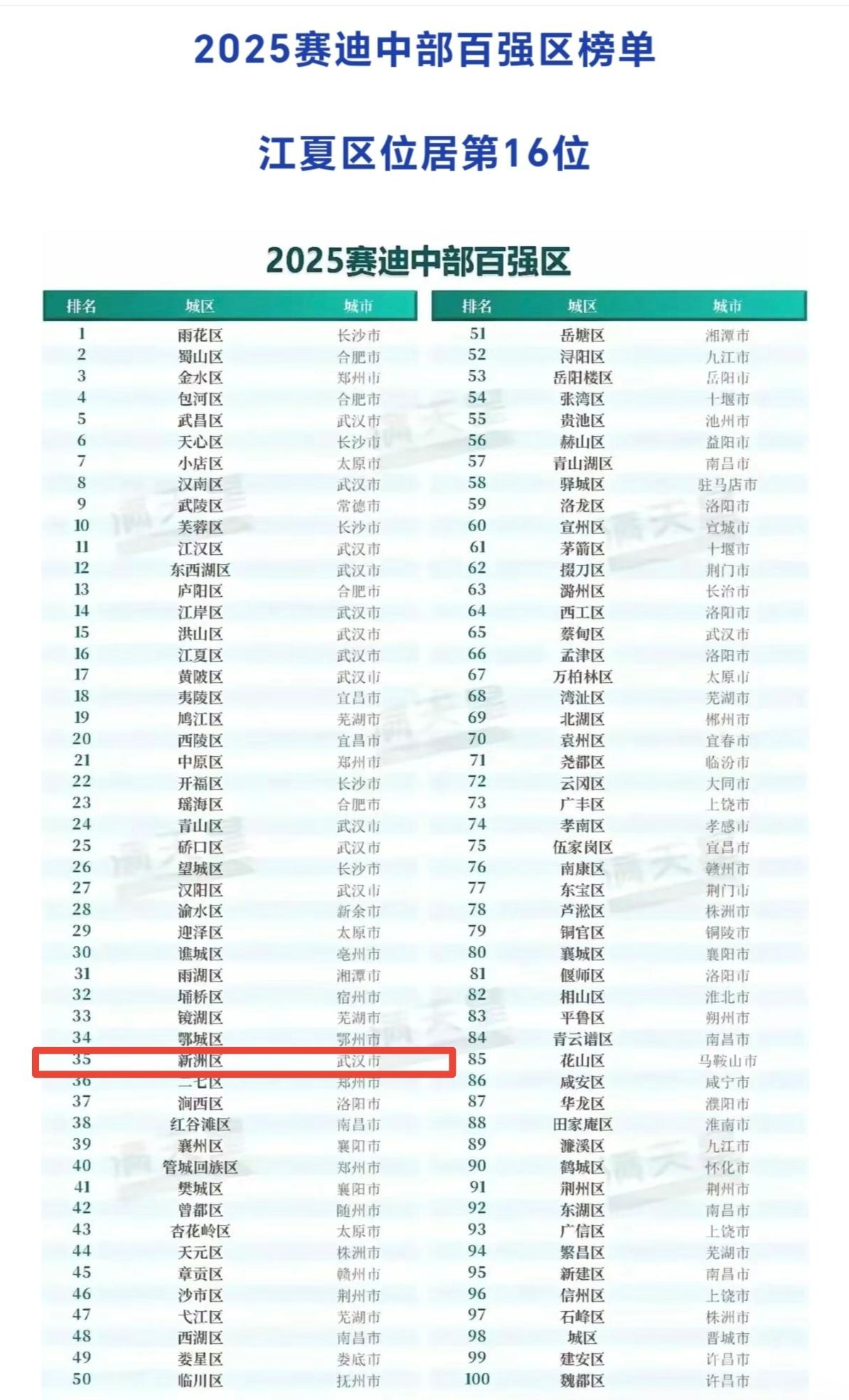 全国排名第35位! 2025年11月6日 赛迪顾问城市经济研究中心发布 2025赛迪中部百强区榜单 新洲区位居第35位! 从规模层级看,中部百强区高度集中在1000亿元以下的区间,共有75个城区,是支撑中部城区经济发展的主要力量。具体看,地区生产总值4000亿元以上的城区有1个,2000亿-3000亿元的城区有4个,1000亿-2000亿元的城区有20个,700亿-1000亿元的城区有25个,400亿-700亿元的城区有47个,400亿元以下有3个,400亿元以上的城区总体呈现“金字塔”式的分布形态。 据了解,赛迪顾问发布的中国中西部城区经济高质量发展研究成果,采用了5个一级指标、23个二级指标,对中部226个城区(不包括直辖市辖区和国家级新区)进行评价,最终形成2025赛迪中部百强区名单。