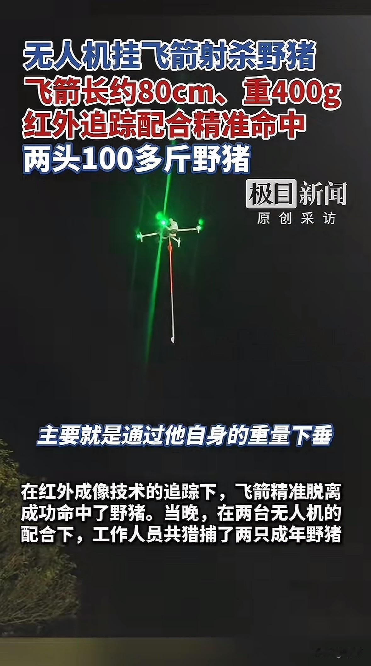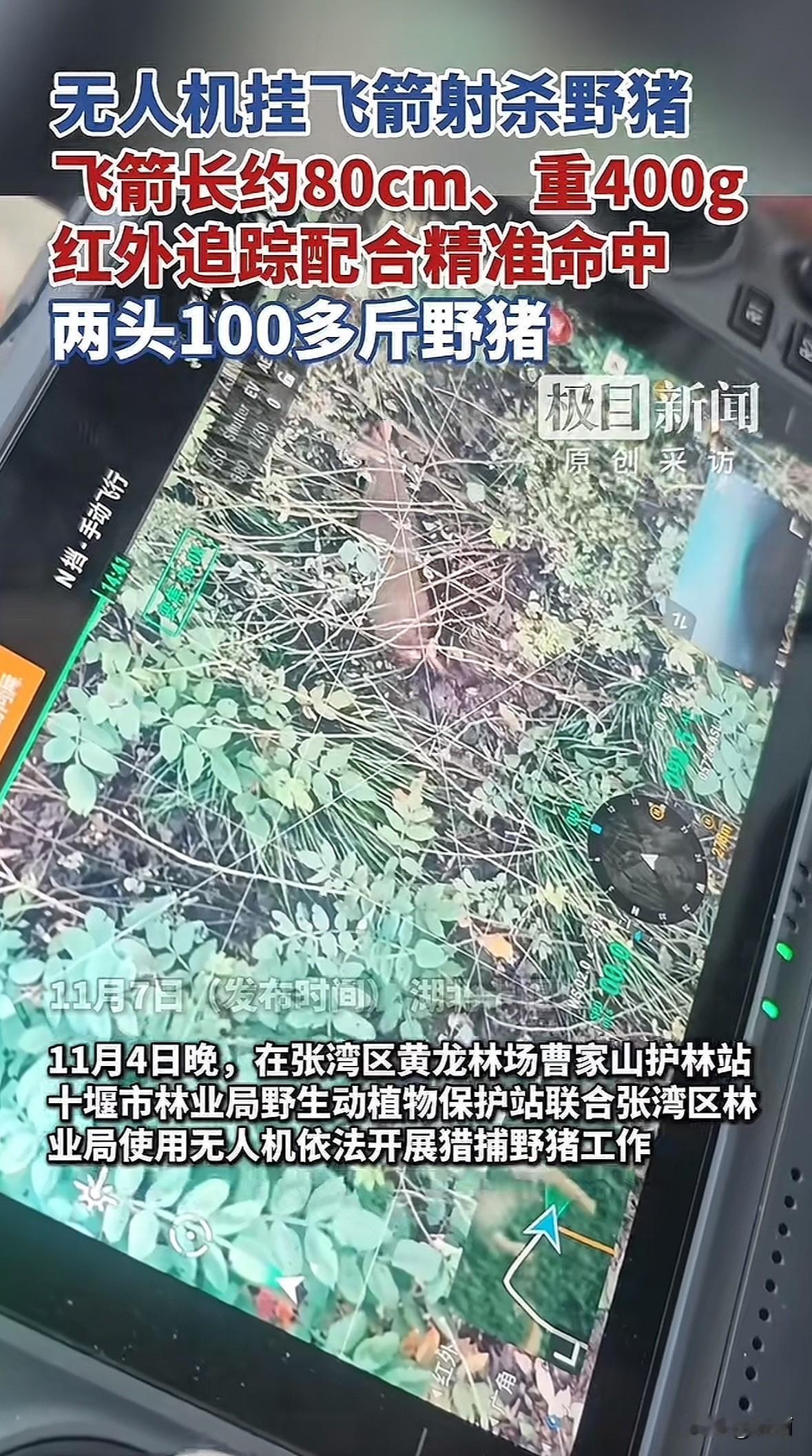 11月4日晚,十堰林业部门在张湾区黄龙林场试点无人机猎野猪,靠红外热成像锁定3头野猪,用挂80厘米特制飞箭的无人机精准命中,成功猎捕2头成年野猪。这是针对当地山高坡陡地形的科学办法,还经过了正规审批备案。 现在野猪泛滥,十堰近四年接到3000多起野猪侵害事件,毁庄稼还可能伤人。但要注意,这种捕猎得专业部门来,私自用无人机挂箭捕猎违法,还可能误杀家畜。 官方用高科技调控野猪种群,既护了农民利益,又不破坏生态,挺靠谱。但也得规范管理设备,避免被滥用,你们觉得该怎么更好管控这种捕猎方式?