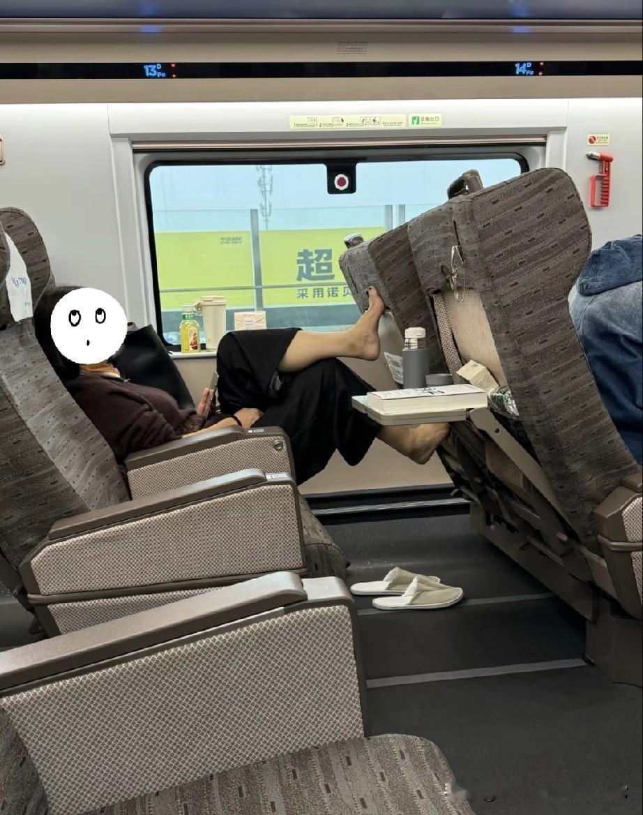 花一等座的钱,我成了别人的“脚蹬子” 斥巨资买高铁一等座,本想摊开电脑安静办公,结果一抬头——邻座大姐脱了鞋,把脚跷在我正用的小桌板上,那味儿还顺着空调往我这边飘… 瞬间懂了什么叫“花钱买罪受”:一等座的票价,二等座的体验,连小桌板都成了别人的“脚托”。 评论区吵翻了:有人骂“没素质就别出门”,也有人说“坐高铁放松一下怎么了”。可问题是,放松能不能别霍霍别人的办公位? 你们觉得:公共空间里,“舒服自己”和“尊重他人”,到底该怎么平衡?