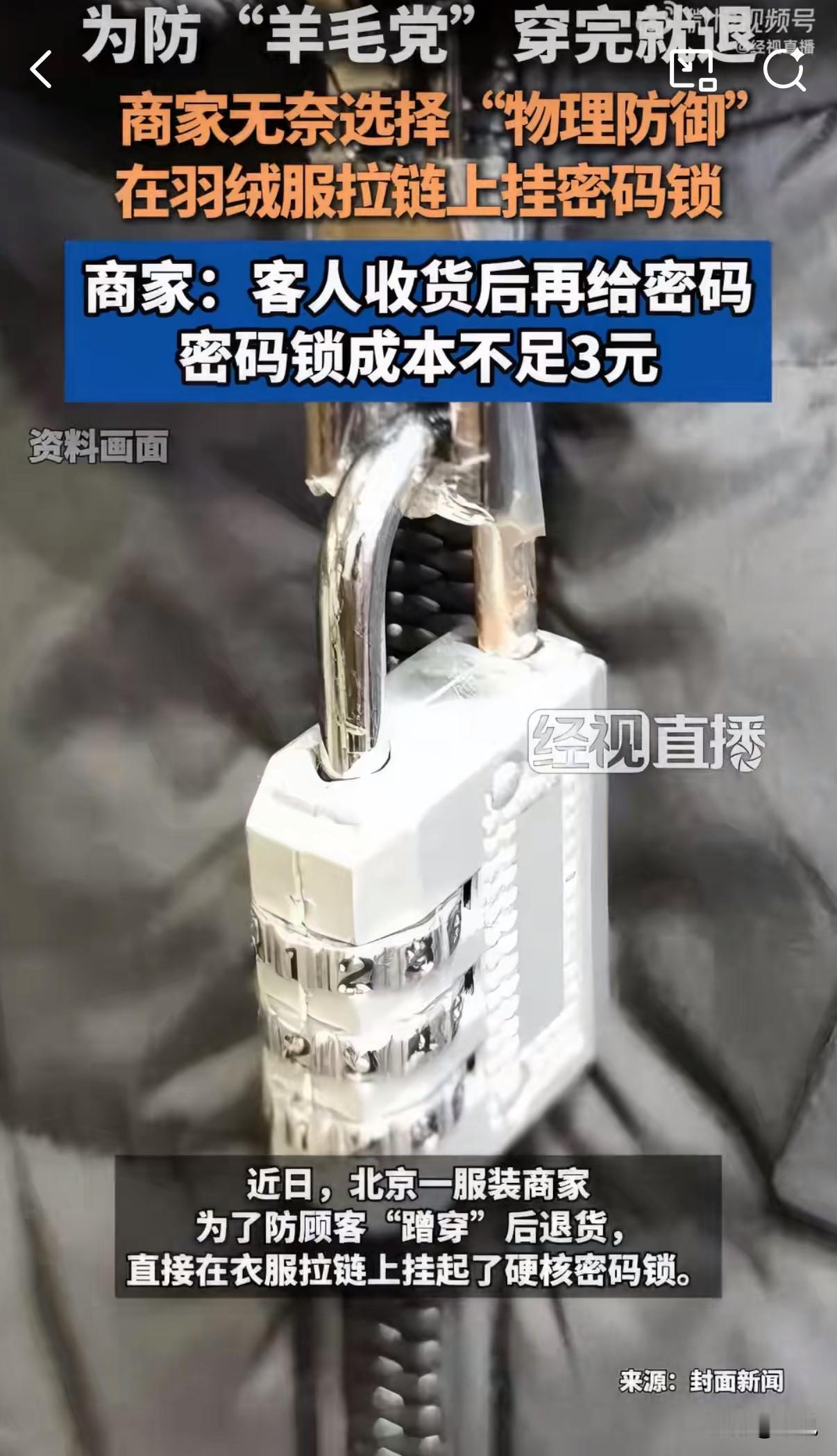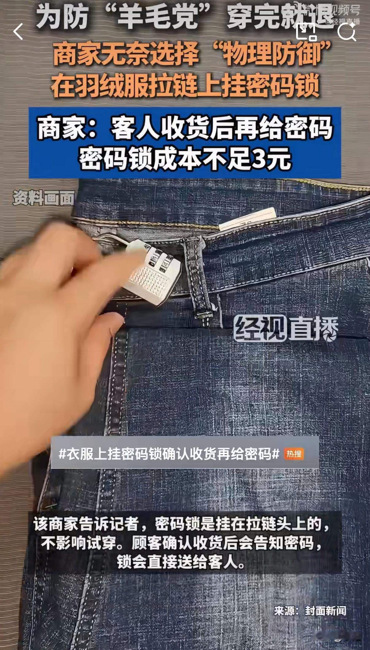 现在做电商也太难了,衣服上挂密码锁、吊牌做得比A4纸还大,这些操作真是让人哭笑不得。 昨天刷到北京一位服装商家的视频,他在衣服拉链上装了密码锁。商家解释:“去年被客人穿完再退的衣服,让我亏了好几千。今年退回来的衣服,一股洗衣液味道,明显是穿过了。” 这种情况还真不少。广州做女装的李女士算了一笔账:“去年双十一备了500万的货,结果退回来将近400万。光运费险就赔了12万,很多衣服领口有粉底,袖口起球,根本没法再卖,直接损失八十多万。” 商家们开始精打细算。超大吊牌成本要8元,而密码锁不到3元。比起被蹭穿后只能报废的冬装,挂锁成了无奈之选。 高退货率的背后,是双方的无奈。有消费者收到衣服时,发现袖口有口红印,口袋里还有半张电影票。买家联系客服:“你们发货前不检查吗?”客服也很委屈:“每件都仔细检查过才发出的。” 另一边,某电商平台推出“仅退款”服务后,小额商品的纠纷明显减少。平台经理说:“以前处理一单退货要来回沟通十几次,现在系统自动处理,省下的人力可以加强品控。” 有意思的是,有商家在包裹里放手写卡片:“如果您不满意,请联系我们解决,别直接退货。”这个小小的举动,竟然带来了20%的复购率。 也有暖心的例子。一位买家留言:“衣服洗后有点缩水,不用退货,给张优惠券就行。”还有商家在标签上注明:“退货衣物将捐赠给山区”,意外收到了很多消费者的理解和支持。 其实,无论是商家还是消费者,都在寻找更好的相处方式。那个被退回的包裹,可能正装着两个人的期待——一个希望买到满意的商品,一个希望自己的心血不被辜负。 当我们在拆开包裹时,或许可以多一份理解。毕竟,每一件衣服背后,都是真实的人在努力经营着他们的生活。